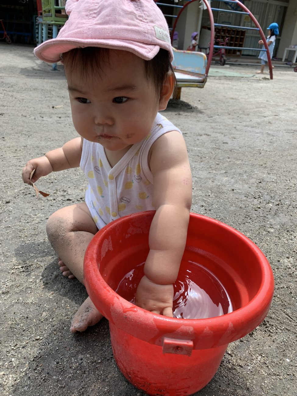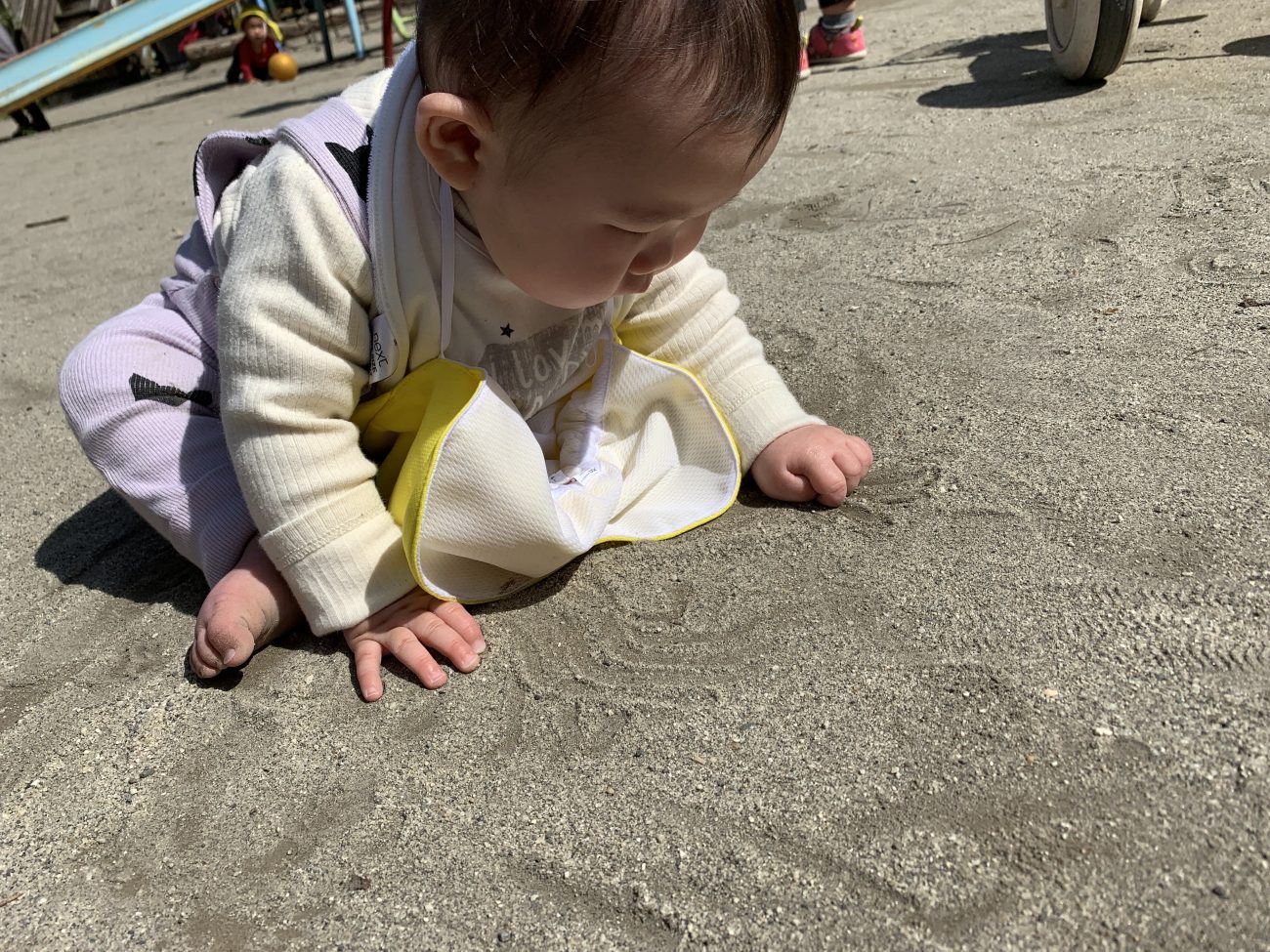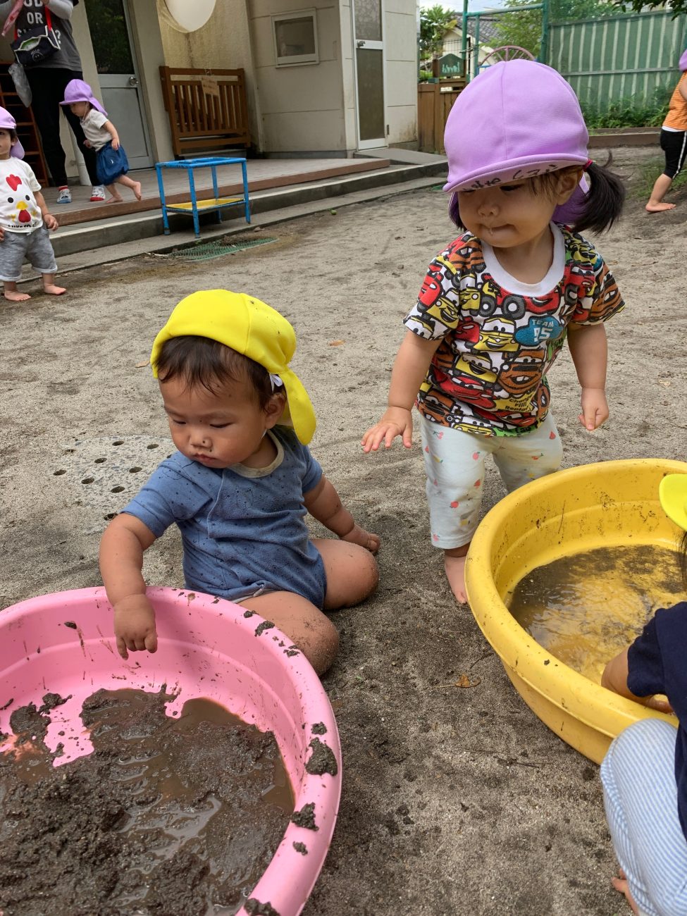 4月から積極的に戸外へ行き、砂や泥・水と触れ合ってきました。感触遊びを経験した0歳クラスの子どもたちについてご紹介します。
