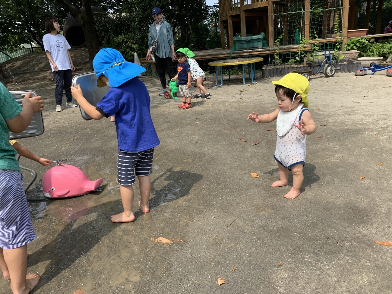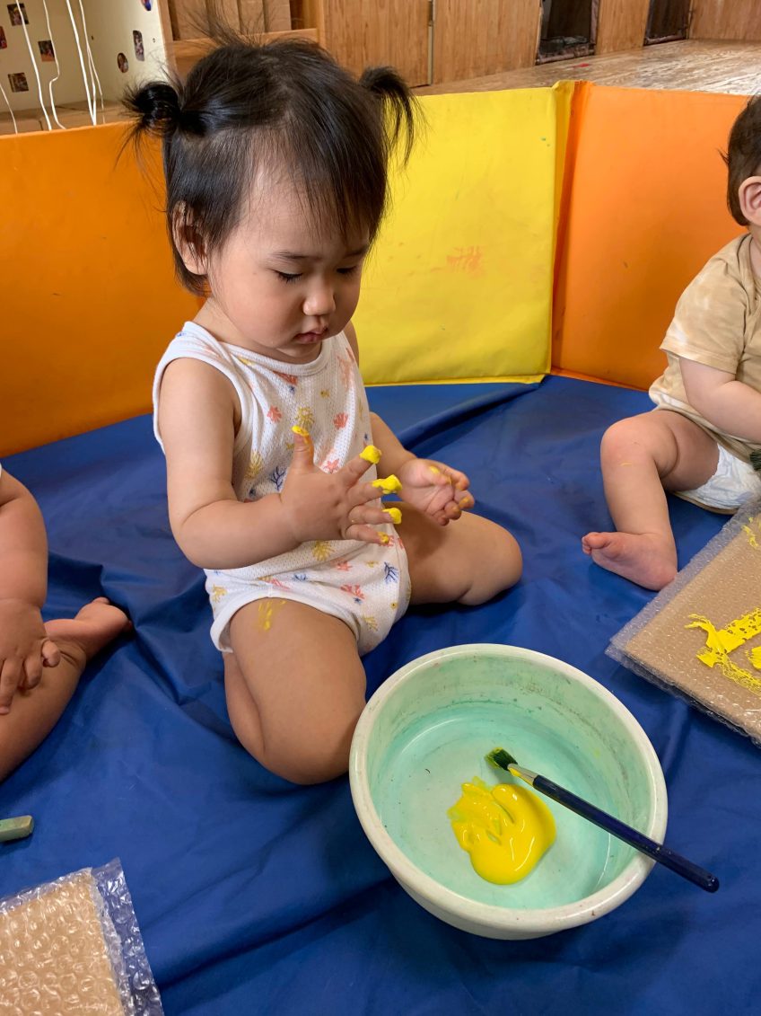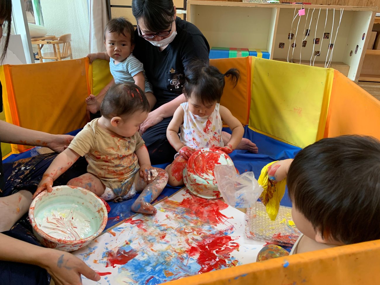 4月から砂・泥・水と触れ合ってきてだいぶ慣れてきた子どもたち。ステップアップとして絵の具での感触遊びを取り入れました。