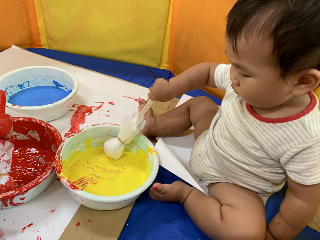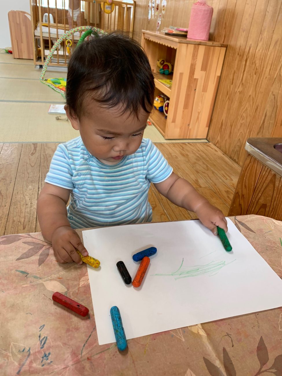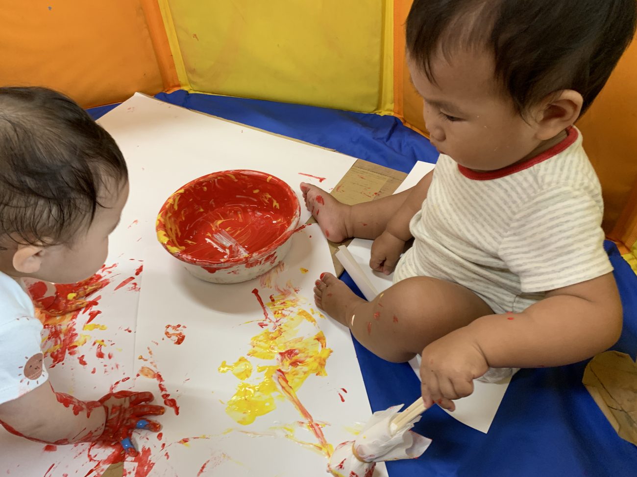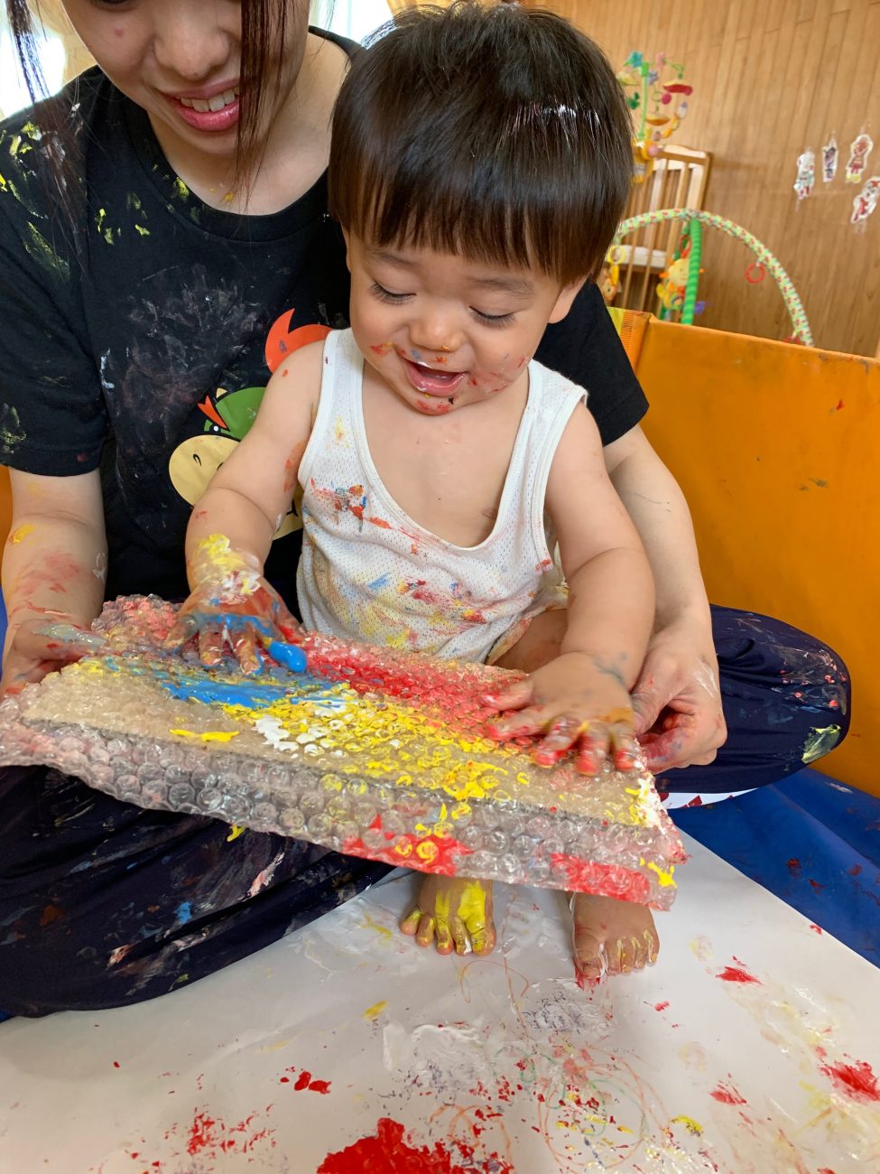 今までの砂や泥とは違いべちょっとした感覚、鮮やかな色、絵の具独特の匂い。驚くのも当然です。保育士も一緒に絵の具に触れてまずは”怖くない”ということを知ってもらいました。