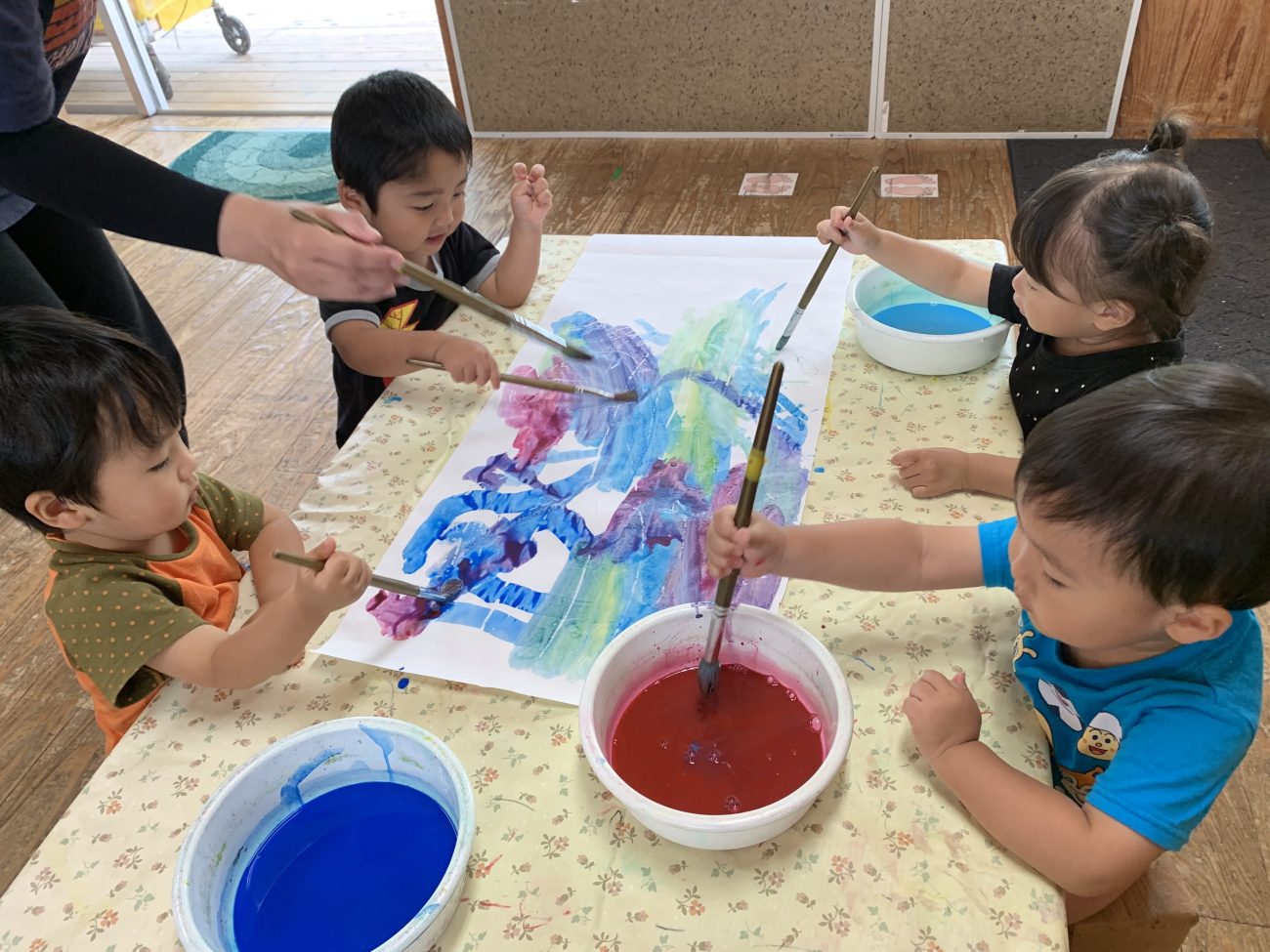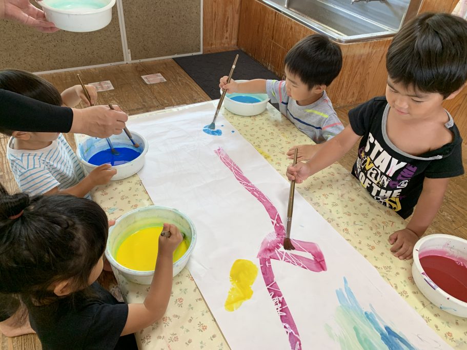 筆を使って絵の具を塗ったのですが、みんな器用に筆を動かし、ダイナミックに色を塗って、あっという間に白い紙がそれぞれの好きな色で埋まっていきました。