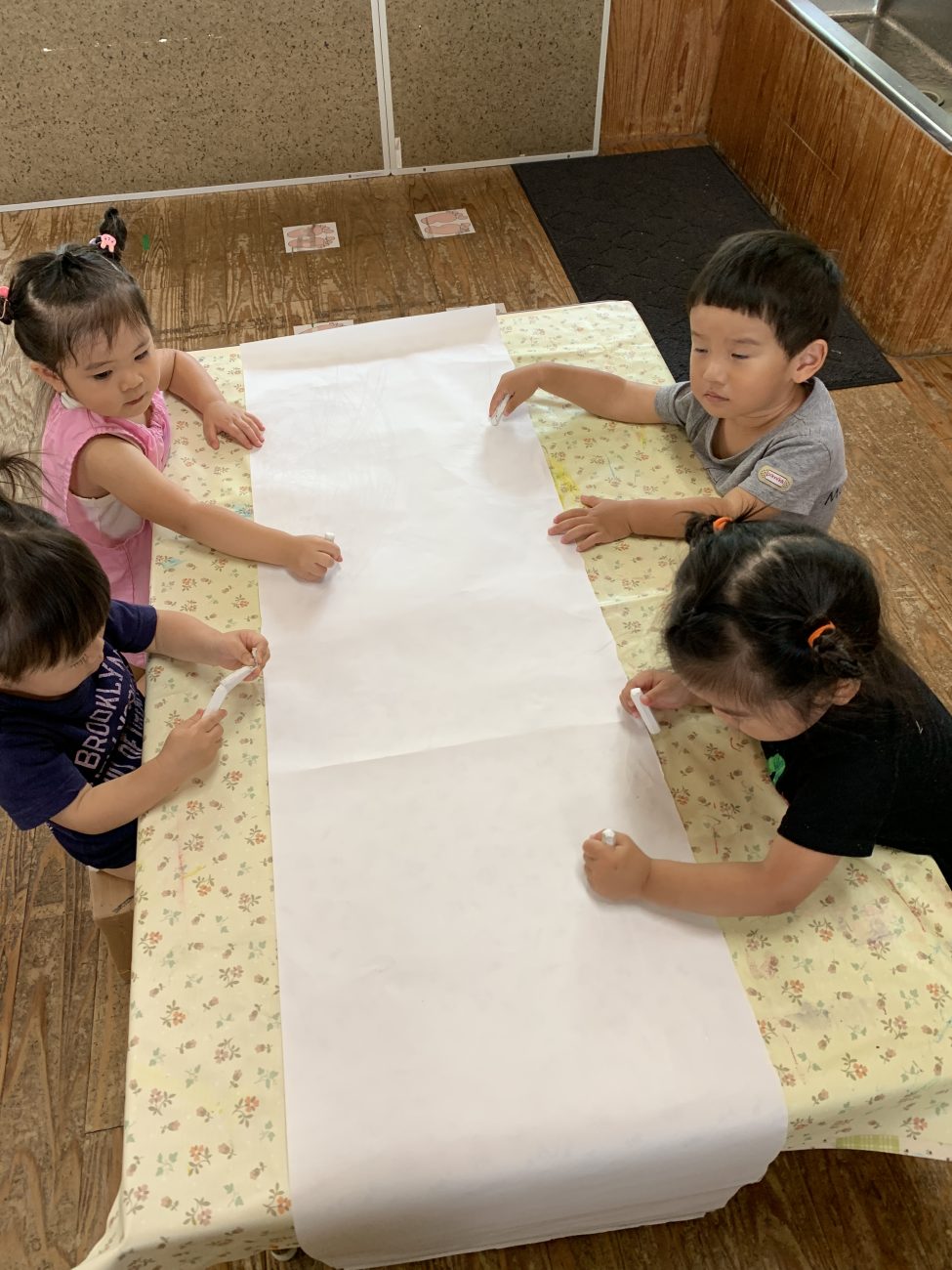 ゆり組(2歳児クラス)でも七夕製作をし、はじき絵で天の川を描きました。【はじき絵】は絵の具とクレヨンを用い、クレヨン(油性のもの)が水を弾くという性質を応用して、その変化を楽しむお絵描きです。