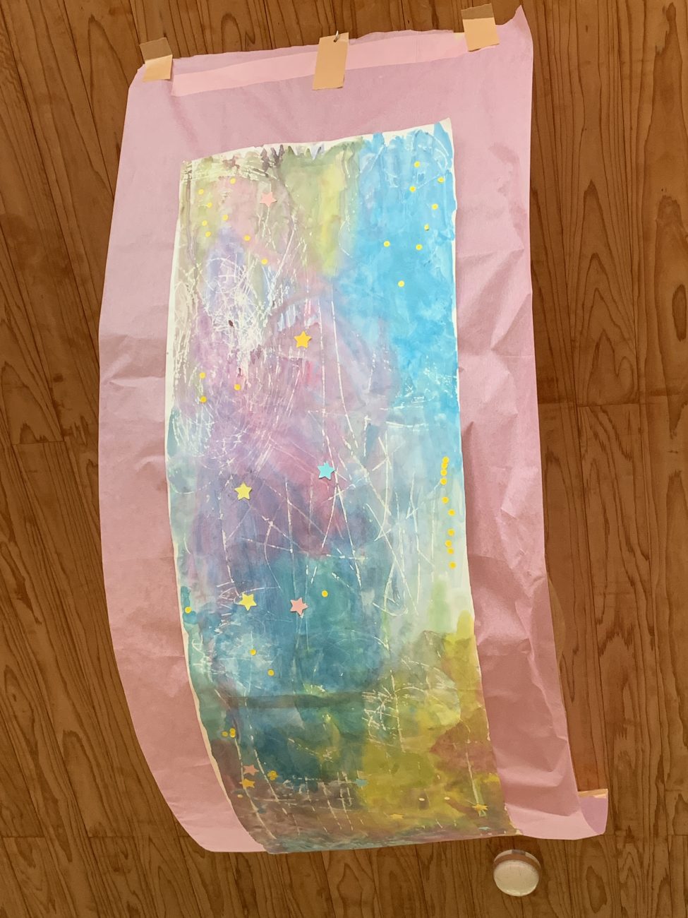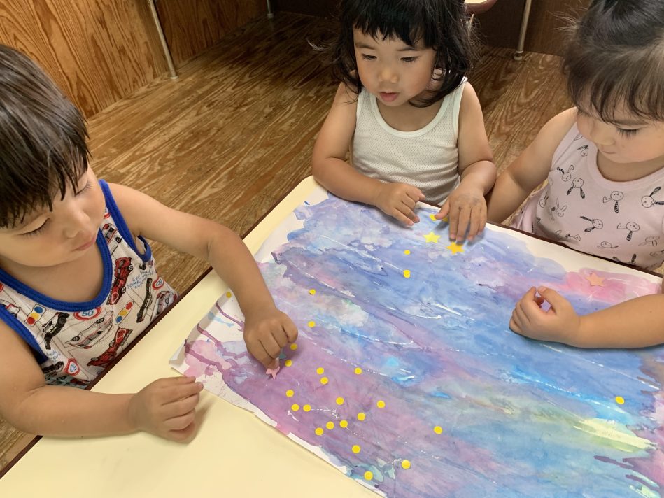 赤、青、白、黄色の4色の絵の具を用意したのですが、「赤と青が混ざったらむらさきになった!」、「(黄色と青が混ざって)こっちは緑になった!」など、混ざり合った色の変化にも気付き、オリジナルの色合いを、筆を使って塗りたくること(ぬたくり)で楽しんでいました。最後に星に見立てたシールを貼りました。