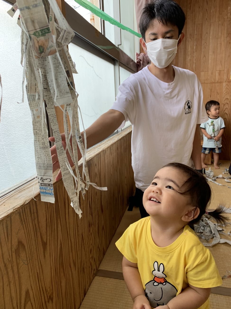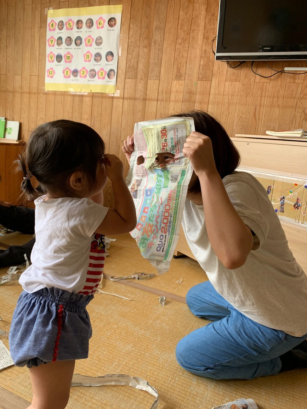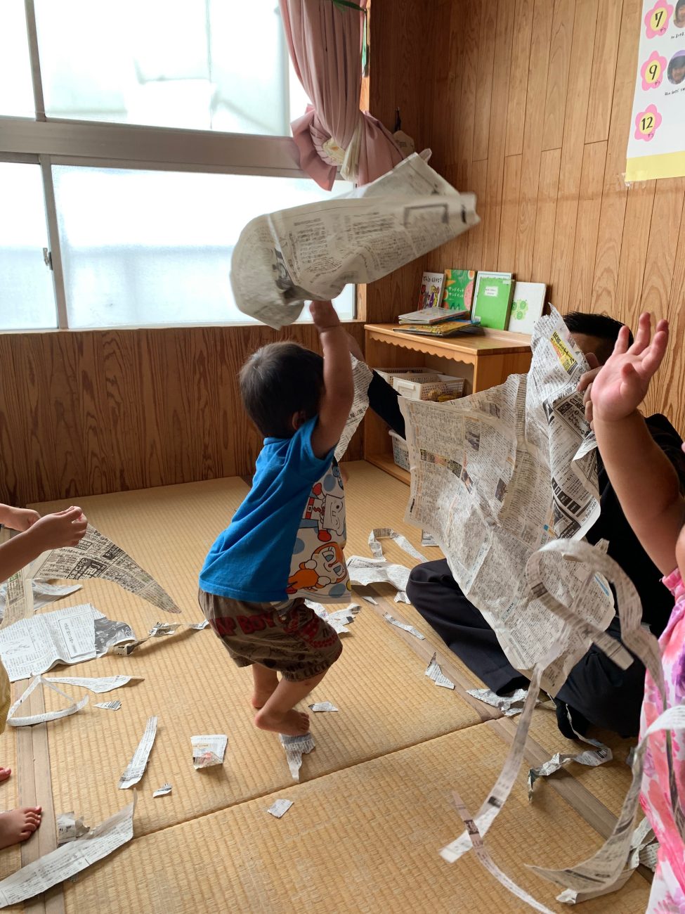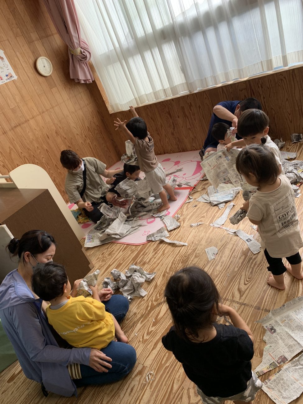 丸めてボールのように投げたり、剣を作ったりと新聞紙という素材ひとつでさまざまな遊びが生まれていました。
