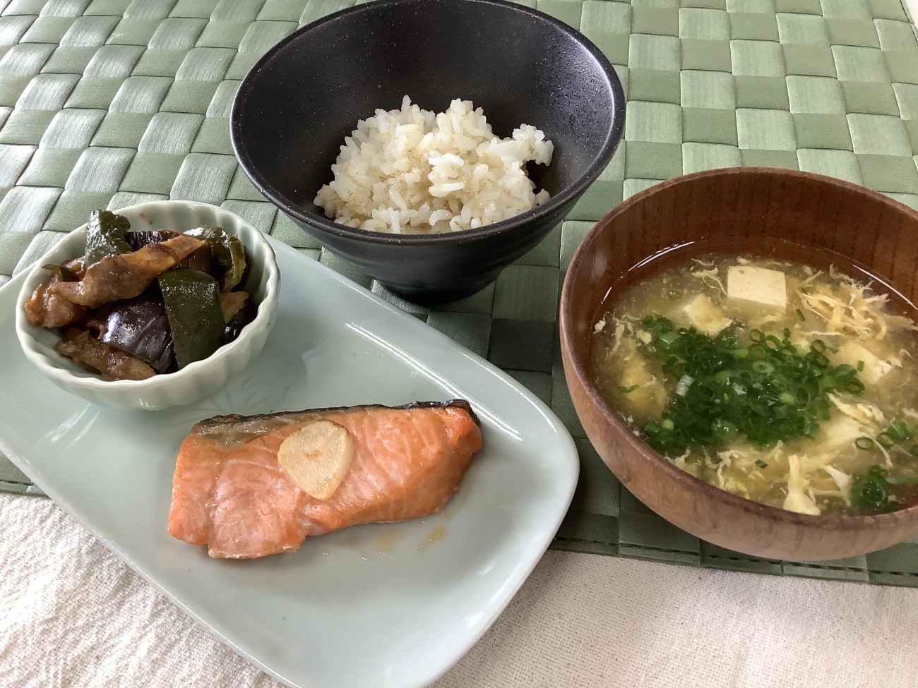 そして、本日のメニューは”鮭のにんにく焼き”なすとピーマンの鍋しぎ””かき玉とろろ汁”’でした。