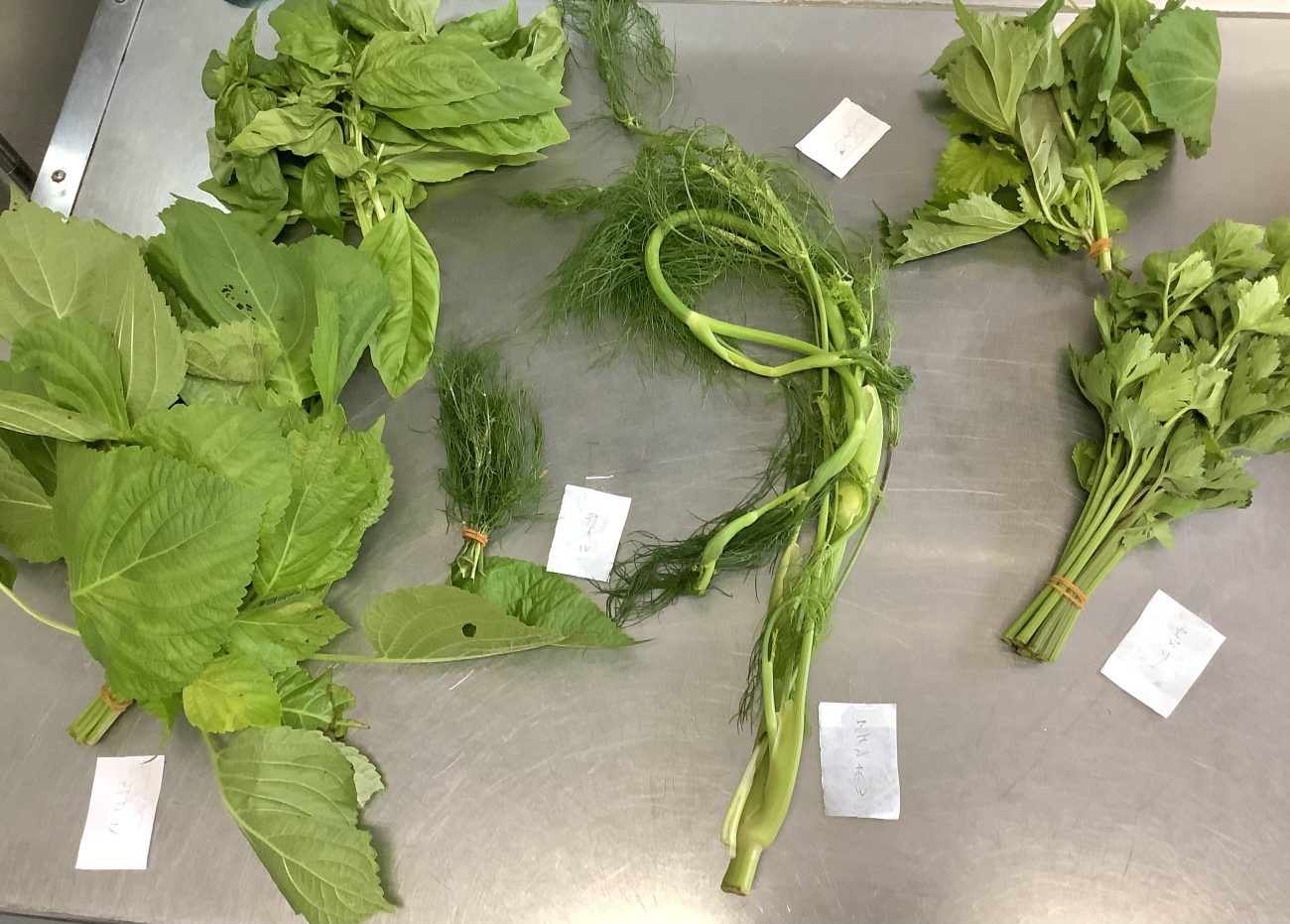 ハーブフィッシュには、エゴマ・パセリ・フェンネル・シソ・バジル・セロリ・ディルを使用しました。多くのハーブを使用しましたが、その中のエゴマについて少し紹介したいと思います。エゴマは、今が旬となっており、防腐作用があるため食中毒の予防になったり、免疫力を高めたりする効果があります。エゴマを選ぶときは、緑の鮮やかなものを選び、できるだけ茶色位部分があるものやしなびているものは避けるようにして選ぶのががポイントです。