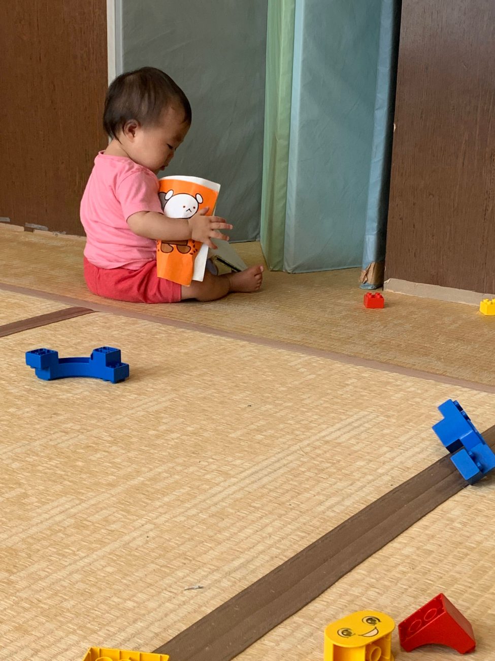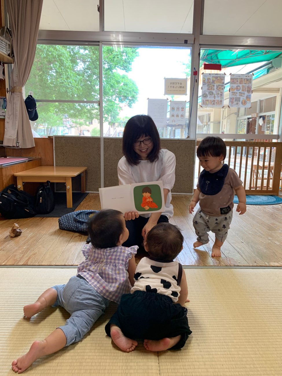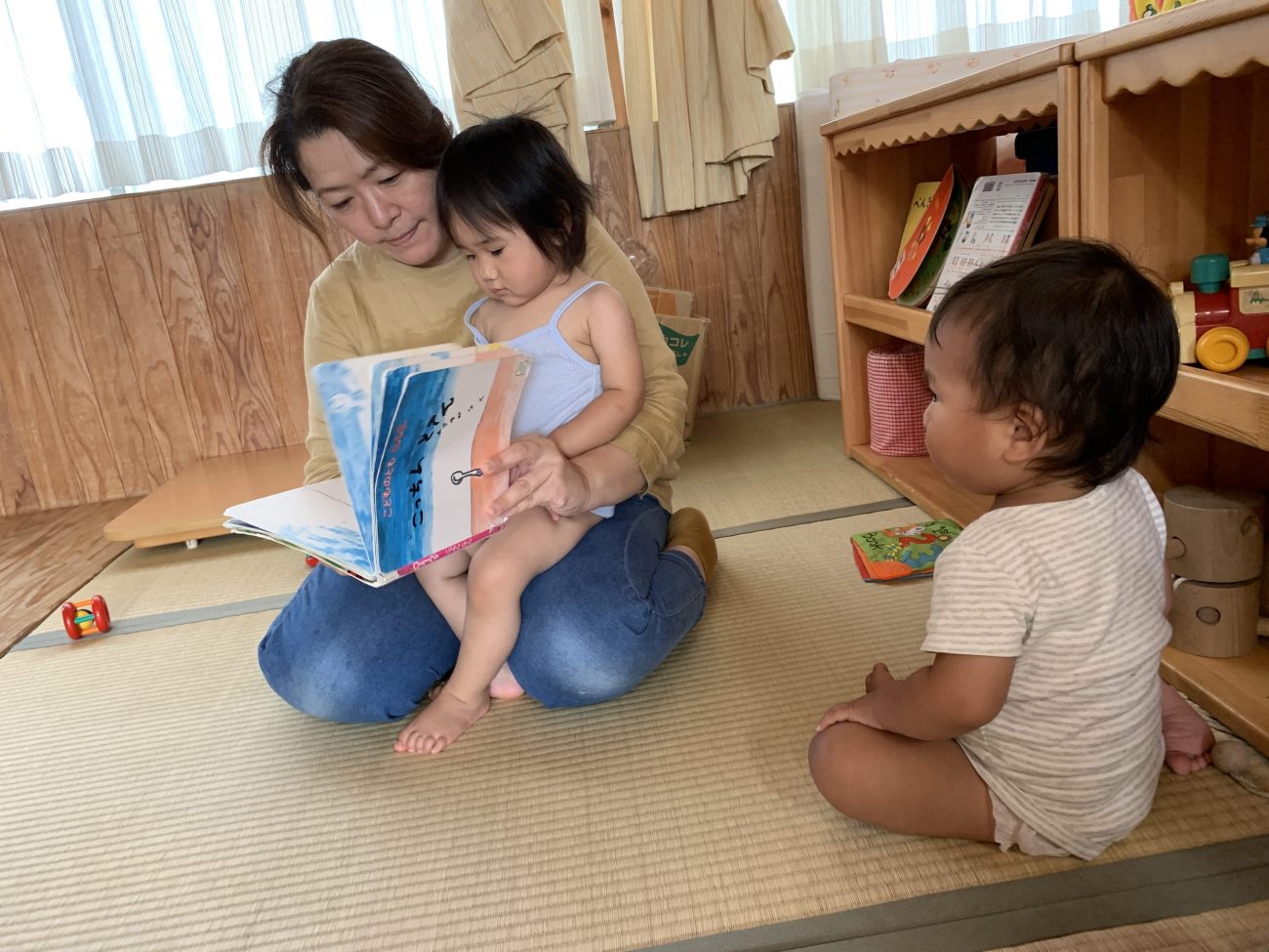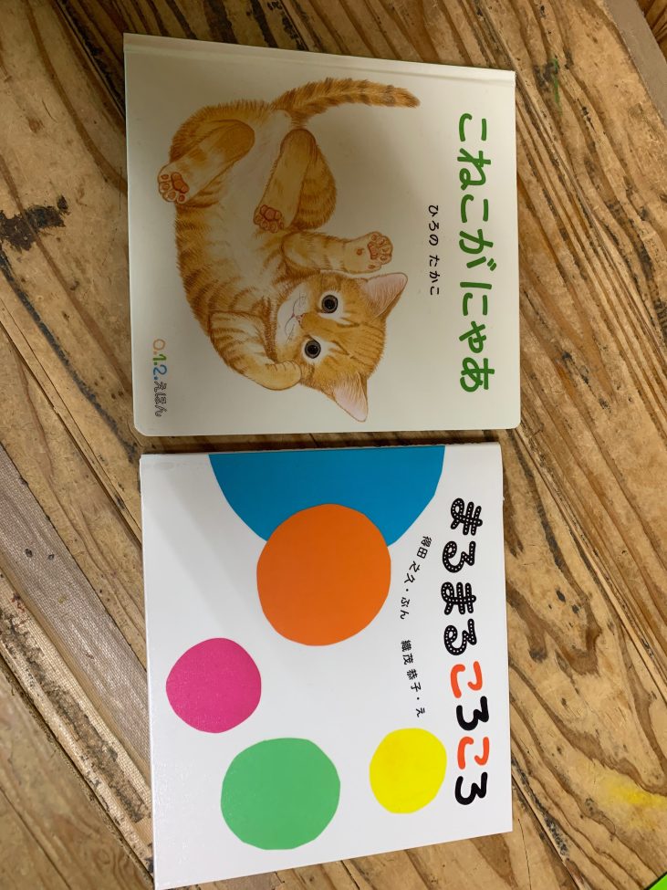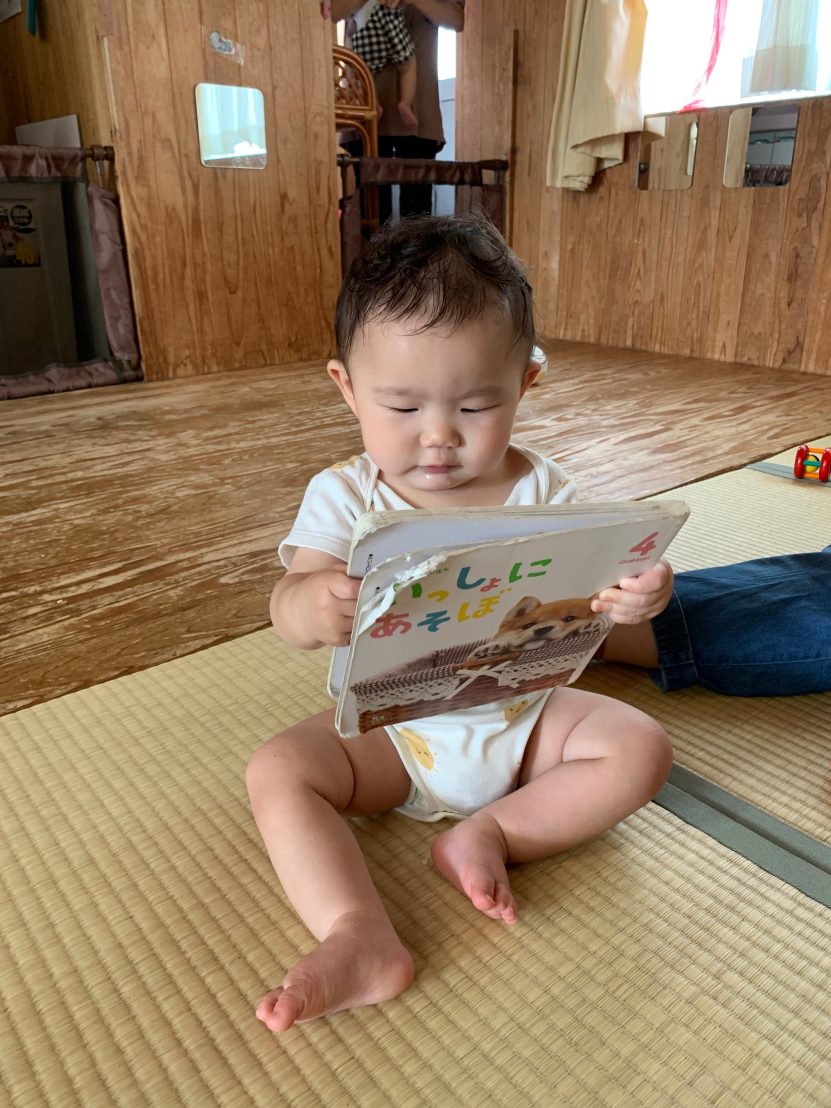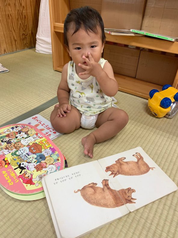 子ども達にとって絵本はまだおもちゃの一つのようです。まずは触って→舐めて→噛んで、感触を確かめたりする子もいます。つまむ、めくるといった指先の動きが少しずつ上手になってきているのを感じる瞬間でもあります。