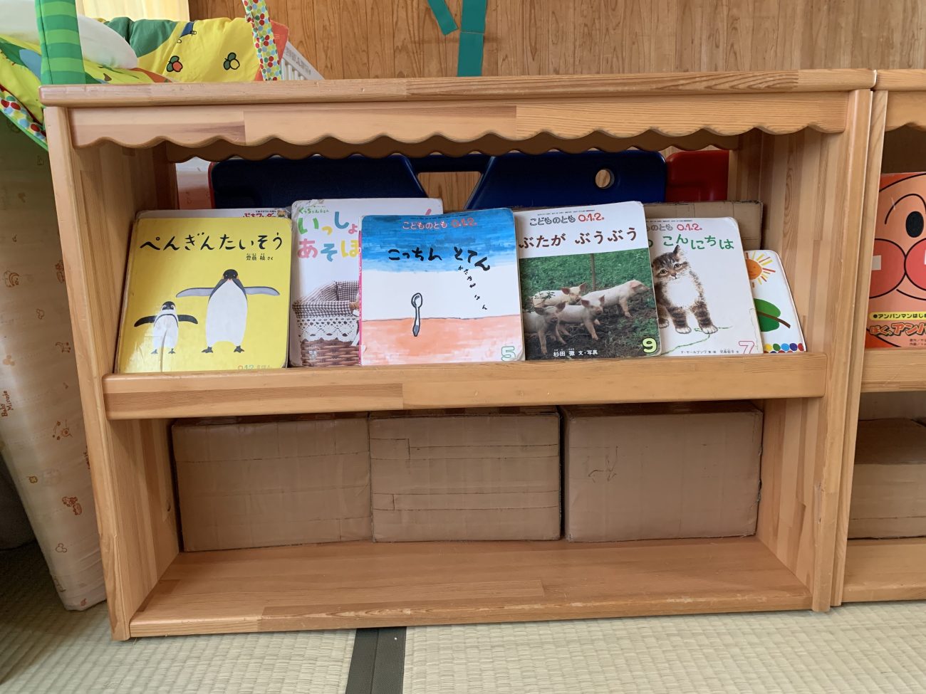 0歳児たんぽぽ組の室内にも子ども達用の絵本が飾ってある棚があります。
