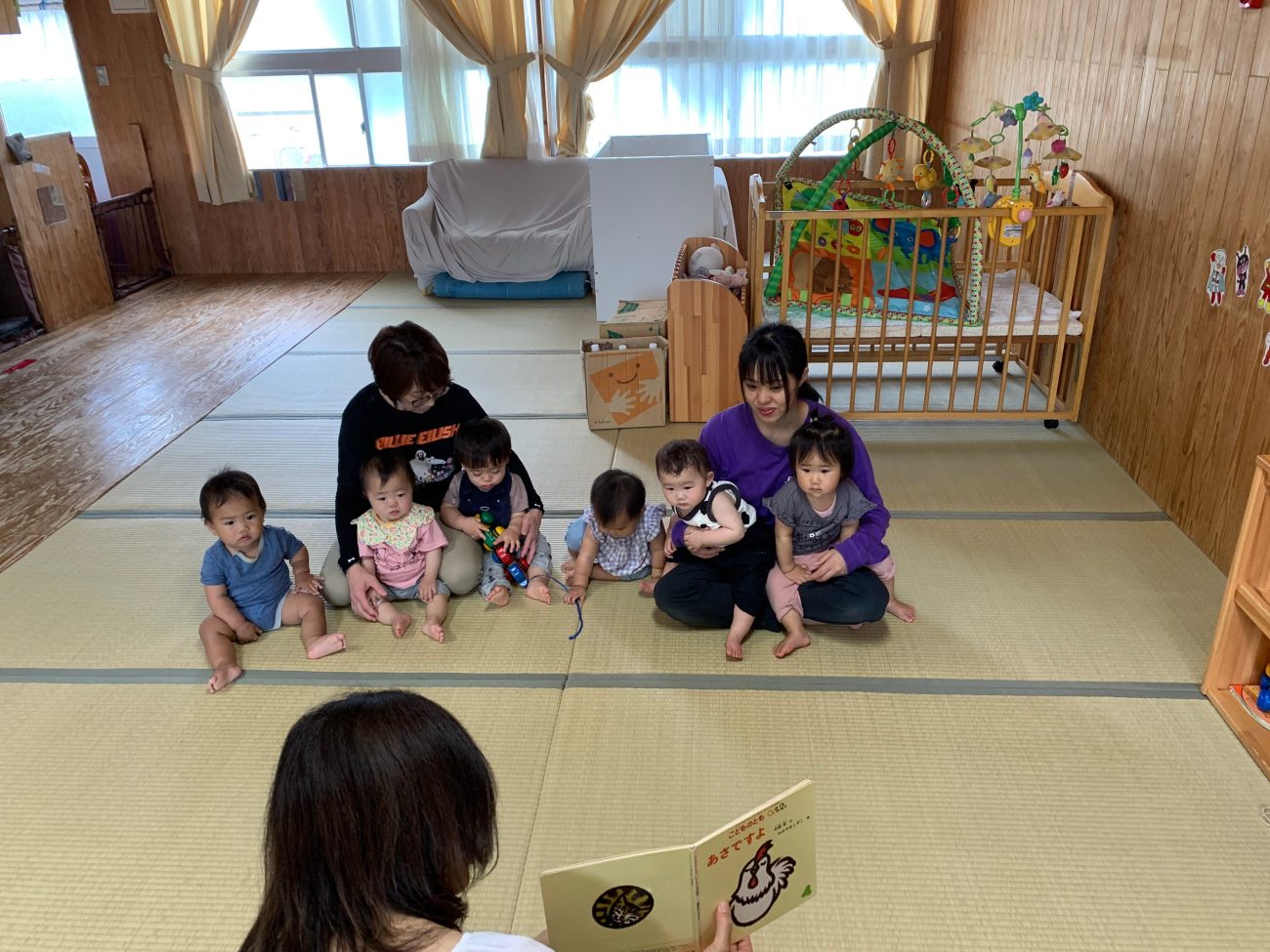 高月齢の子は自分で選んだ本を持って大人に「はい!」と渡し、膝の上に座ると静かに大人の声に耳を傾けます。すると他の子達も次第に近づいて集まってきます。「ワンワンだね」という大人の声に写真や絵を指さして言葉を真似ようとする子もいます。