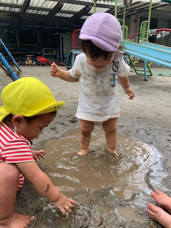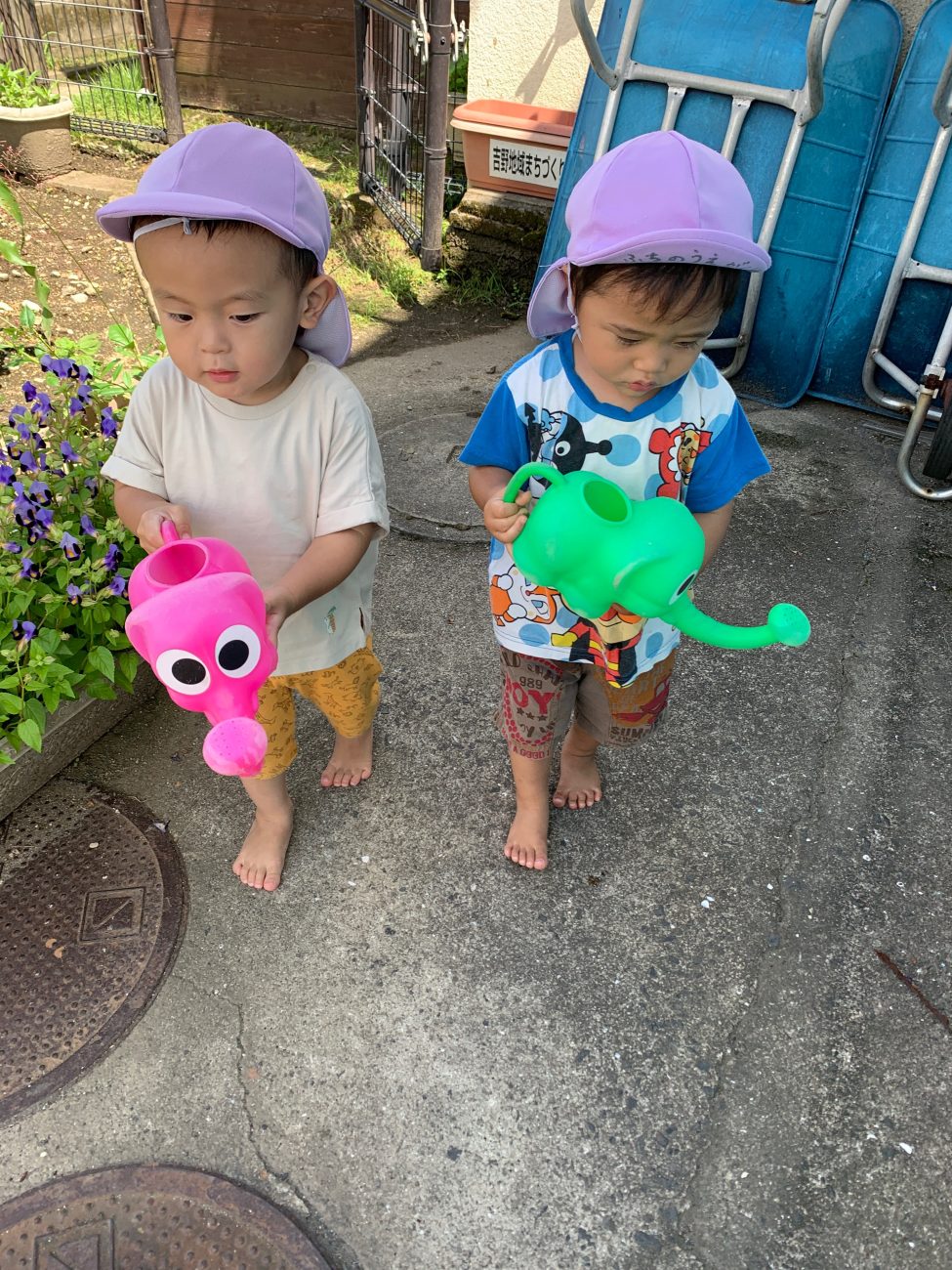 0〜1才のたんぽぽ組の子供たちも遊びの中で無理なく水に触れる事が出来ていると感じます。ビオトープの前で目撃した出来事ですが、年上の子が年下の子に「入ったらあぶないよー。」と声をかけているの見かけました。子供なりの経験の中で危険予測の視点も少しずつ育っているようで、頼もしいと感じました。子供たちが安全な水遊びができるよう、水遊びの危険を伝えていくのも大人の役割だと再認識しました。