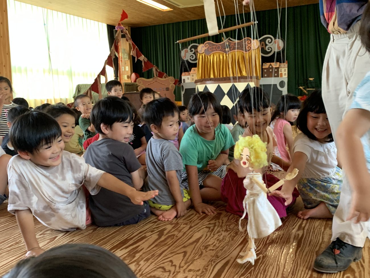 途中、子ども達の元へ操り人形が遊びにきてくれると触りたい一心で手を伸ばす子どもも…