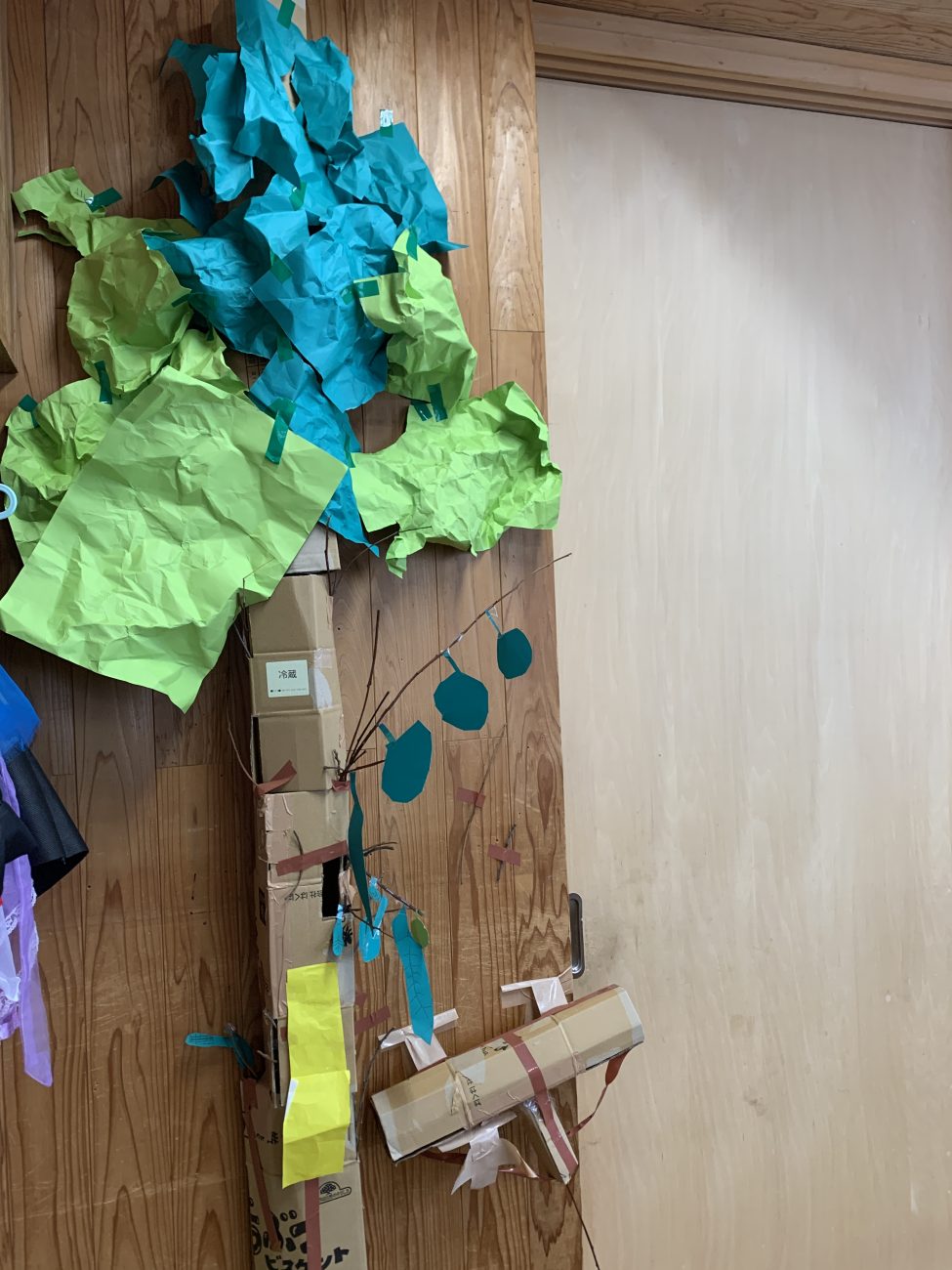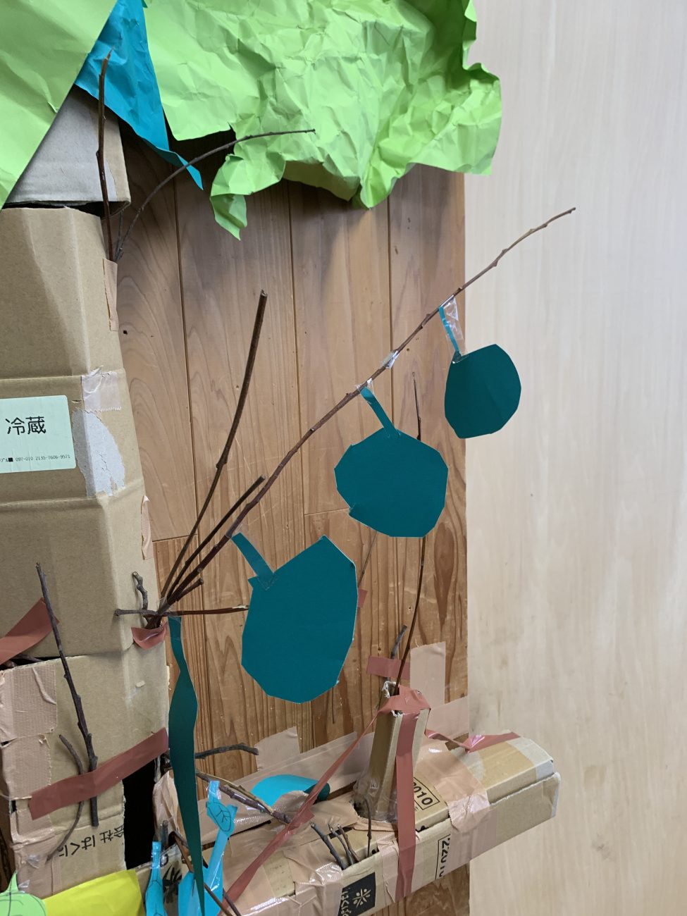『段ボールを丸めて(筒状)にしたものを重ねて、高さのある木を作る』