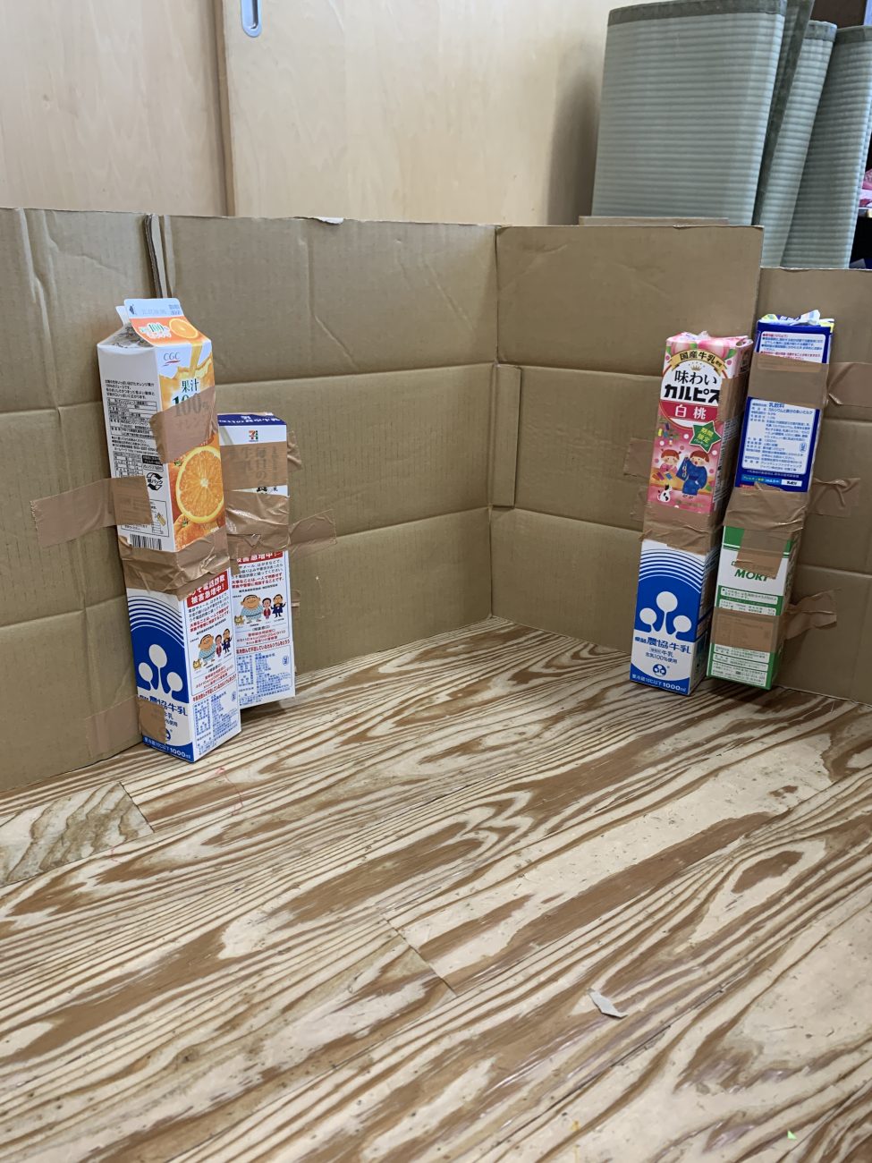 『牛乳パックを段ボールに貼り付けたら、壁みたいに立つよ!それを、繋げていったらどうかな?』