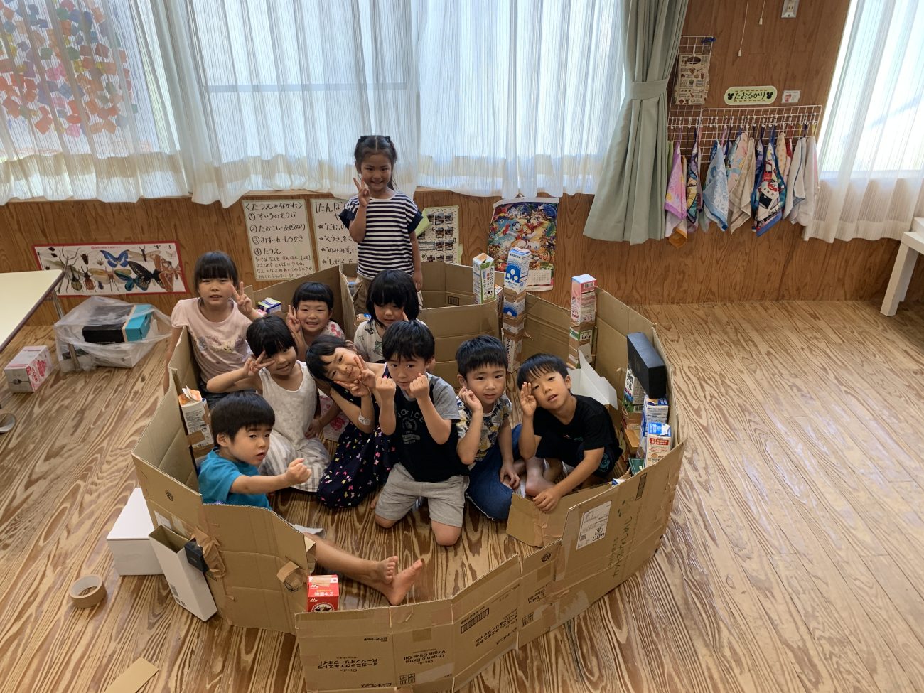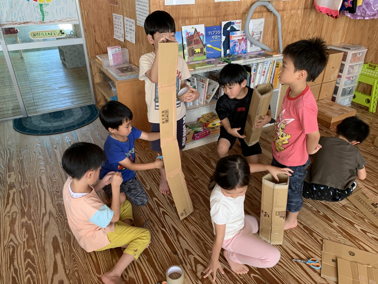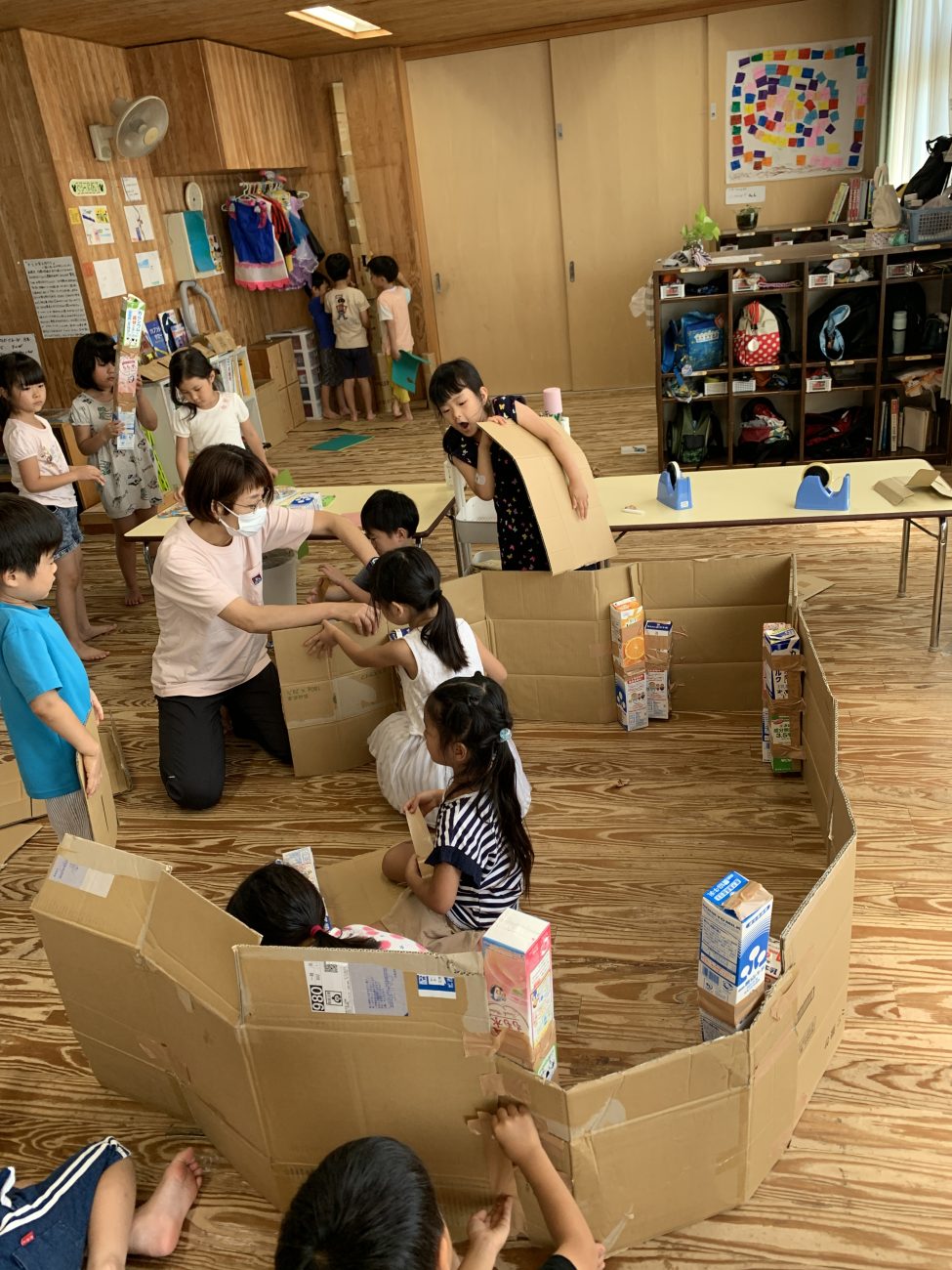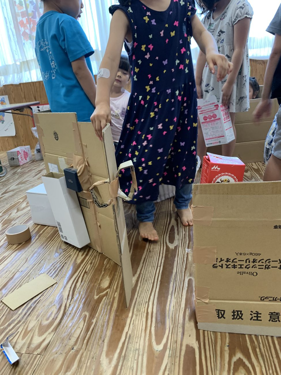 子ども達が考えた今回の創作活動は、協同性(共に力を合わせて行動すること)が必要な活動でした。担任としても、就学を意識する上で、子ども達の中に育みたいことの一つでもあります。まだまだ、大人の介入や声かけが必要ではあります。しかし、ちょっとした大人の援助とアドバイスがきっかけで、友達と協力して作り上げていく力=協同性が子ども達の中に、少しずつ育まれていることを知る事が出来ました。