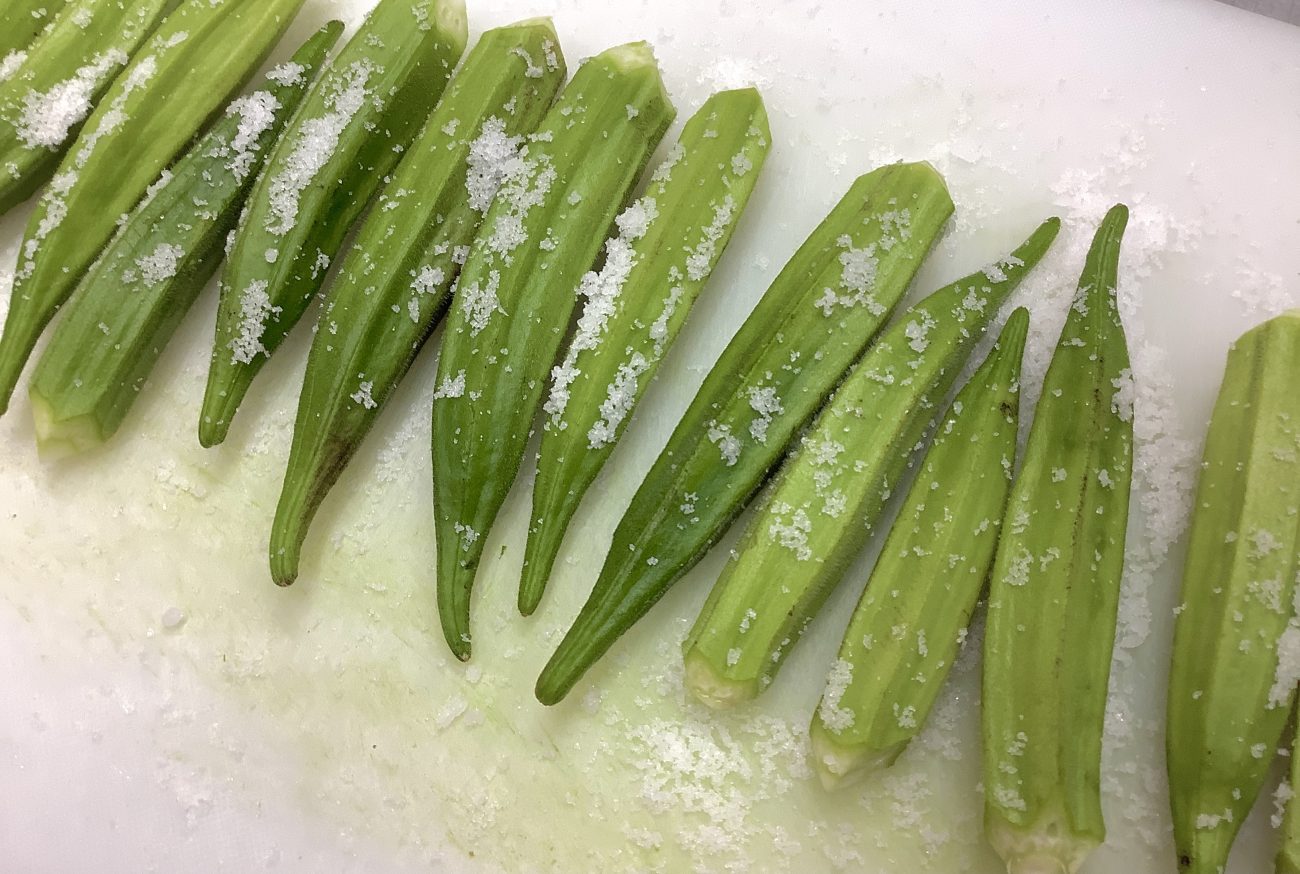 オクラは、板ずりをしてから使用しました。板ずりをすることで、食材の表面に傷がつき、そうすることで調理の際に味が染み込みやすくなります。また、食材の変色を抑える効果もあります。今回はサラダだったので、、オクラの表面にある毛がとれるようしっかりと板ずりをしてから使用しました。さっぱりと梅酢の効いた夏にぴったりのサラダとなりました。
