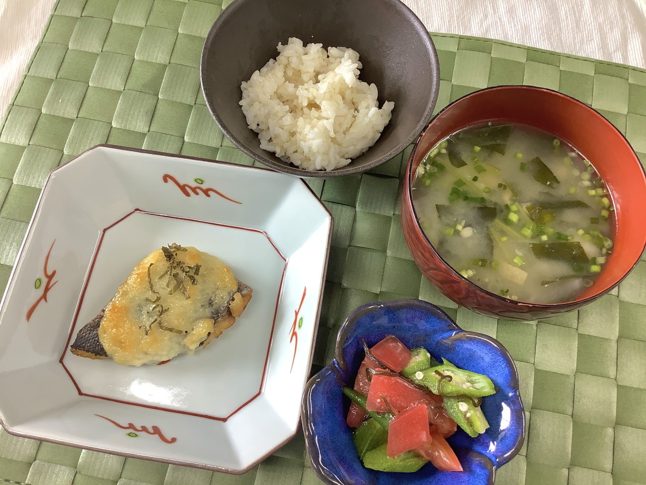 本日のメニューは、”魚のしそマヨ焼き””トマトとオクラの塩昆布和え””しいたけのみそ汁”でした。