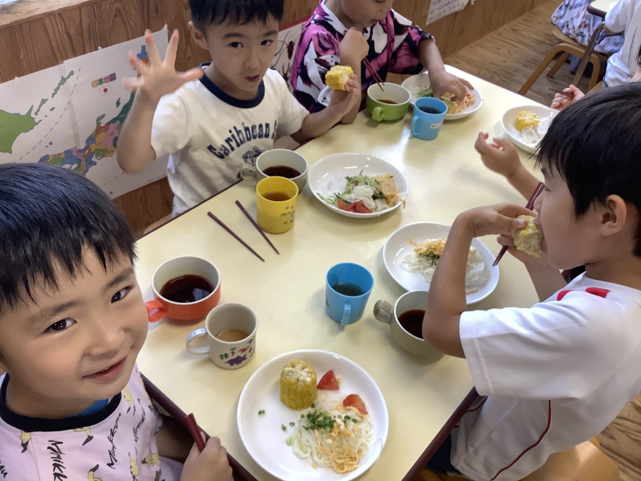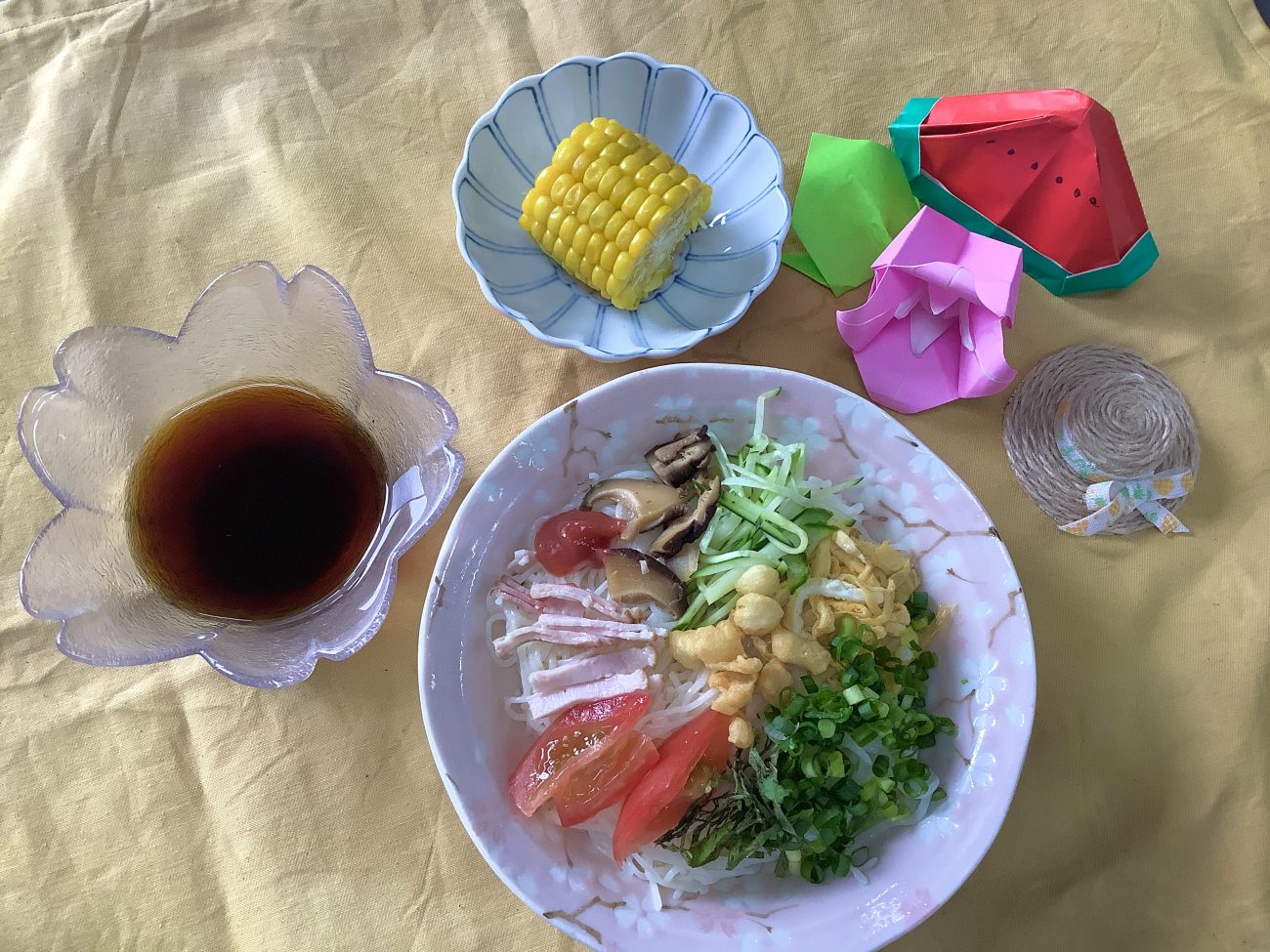 本日のメニューは”具沢山そうめん””ふかしとうもろこし”でした。