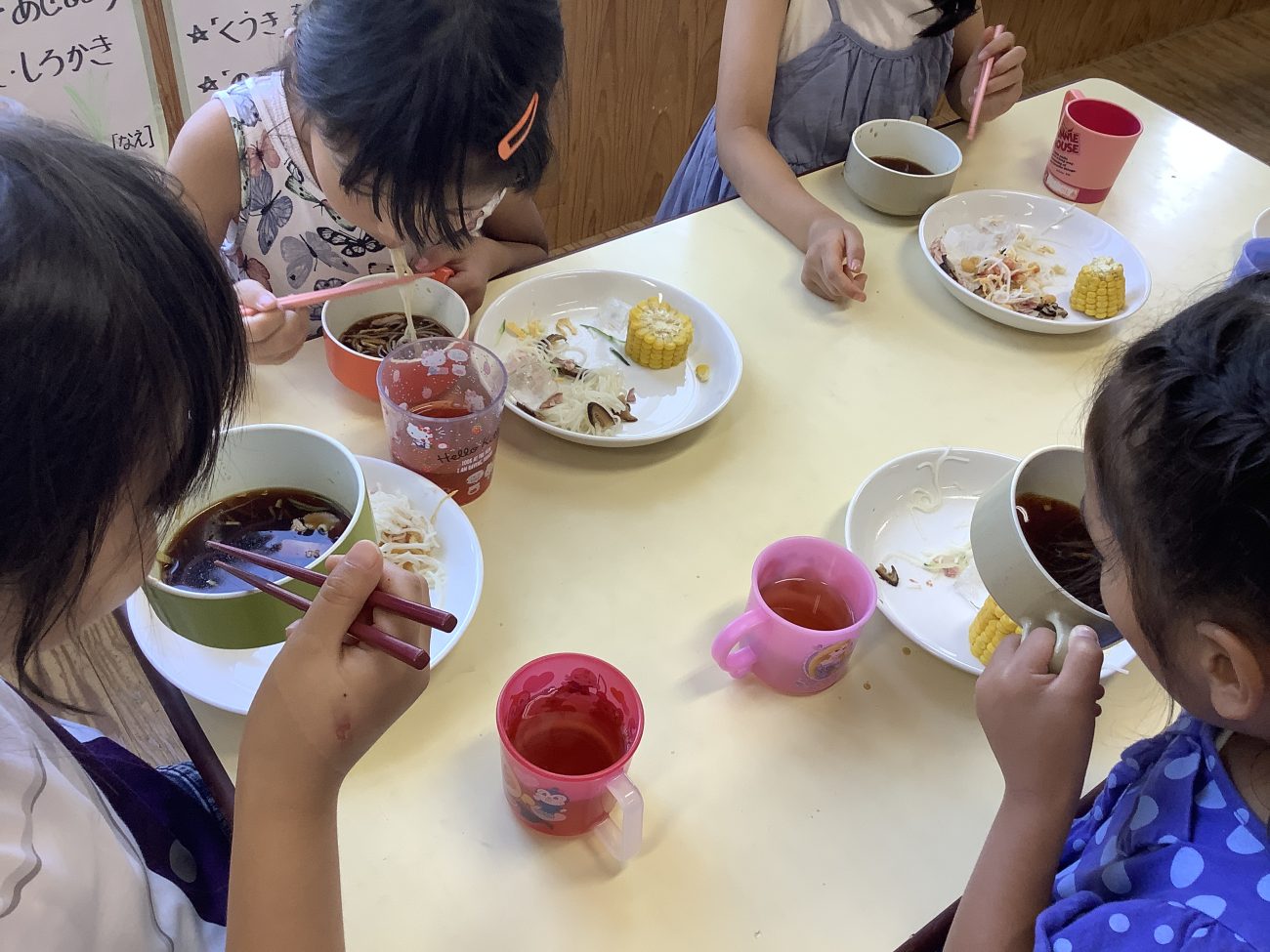 めんつゆは、昆布・鰹節・干し椎茸で出汁をとり一から作りました。椎茸のいい香りが漂うとても美味しい麺つゆとなりました。麺つゆを飲んでいる子もいたと聞き、とても驚きました。
