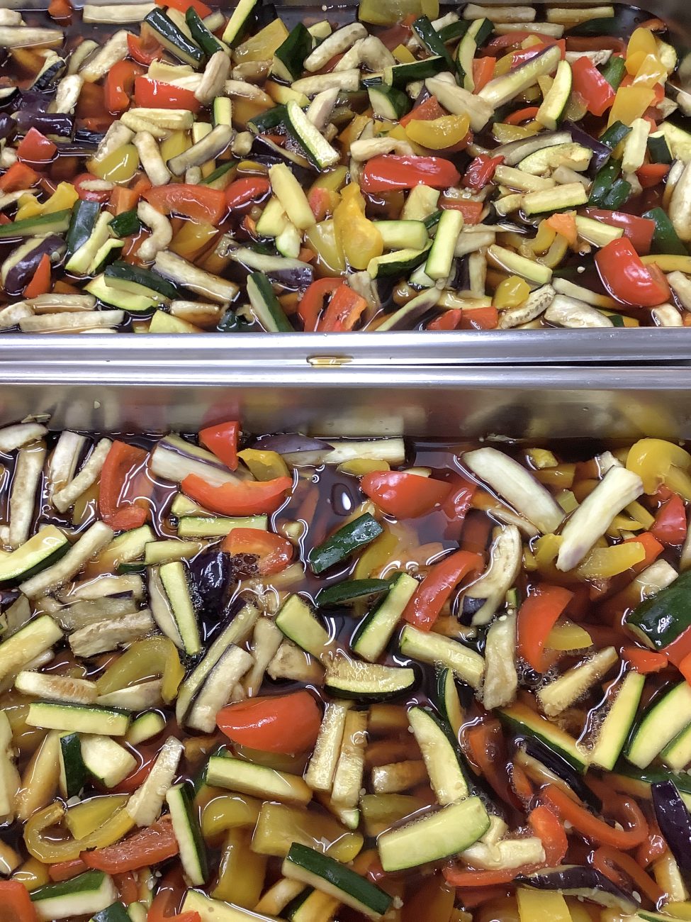 夏野菜の焼き浸しは、パプリカ・ズッキーニ・なすを使用しました。昆布と鰹節から出汁をとり、彩りも綺麗でとても美味しく仕上がりました。子どもたちの苦手な野菜があるかな、と心配でしたが何度もおかわりにきてくれて、特にもも組(4歳児クラス)は3度もおかわりにきてくれました。
