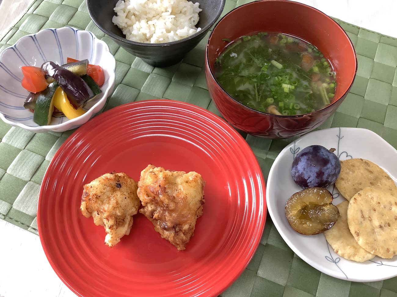 本日のメニューは”とり天””夏野菜の焼き浸し””なめこのみそ汁”でした。