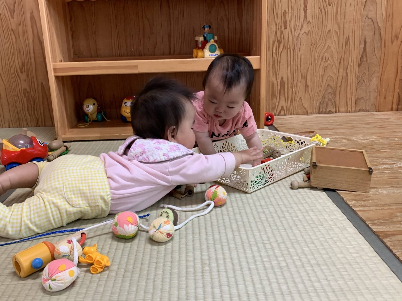 ・1歳前半から芽生えた自我は1歳半から2歳にかけて大きくなり「自分で」「自分が!」と何でも一人でやりたがり何でも一人占めして自分の物にしたがるという欲求が強くなります。と同時に友達との関わりも増えます。1歳後半から模倣遊びが盛んになり、友達と同じことをしたい、一緒に遊びたいという気持ちが表れます。