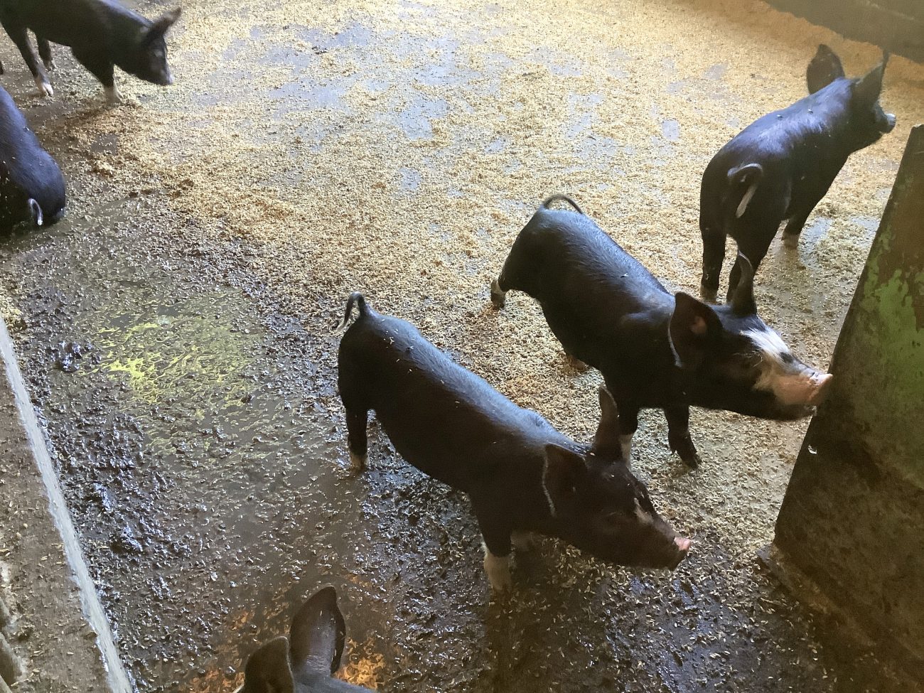 検討をする中で一番重要視するのは、錦ヶ丘のポリシーでもある、安心安全の食へのこだわりです。そこで実際に、提供したいと思っている餃子を作っているゆうかり学園へ足を運び見学させていただきました。水流源彦理事長先生自ら案内・説明をしてくださり、施設を目にしてお話を聞かせていただくと、想像以上のこだわりをもってすべての取り組みをされていました。まず、ゆうかり学園の餃子に使われている六白黒豚は施設内で飼育されています。六白黒豚はその肉質の高さから「黒いダイヤモンド」とも言われるそうです。