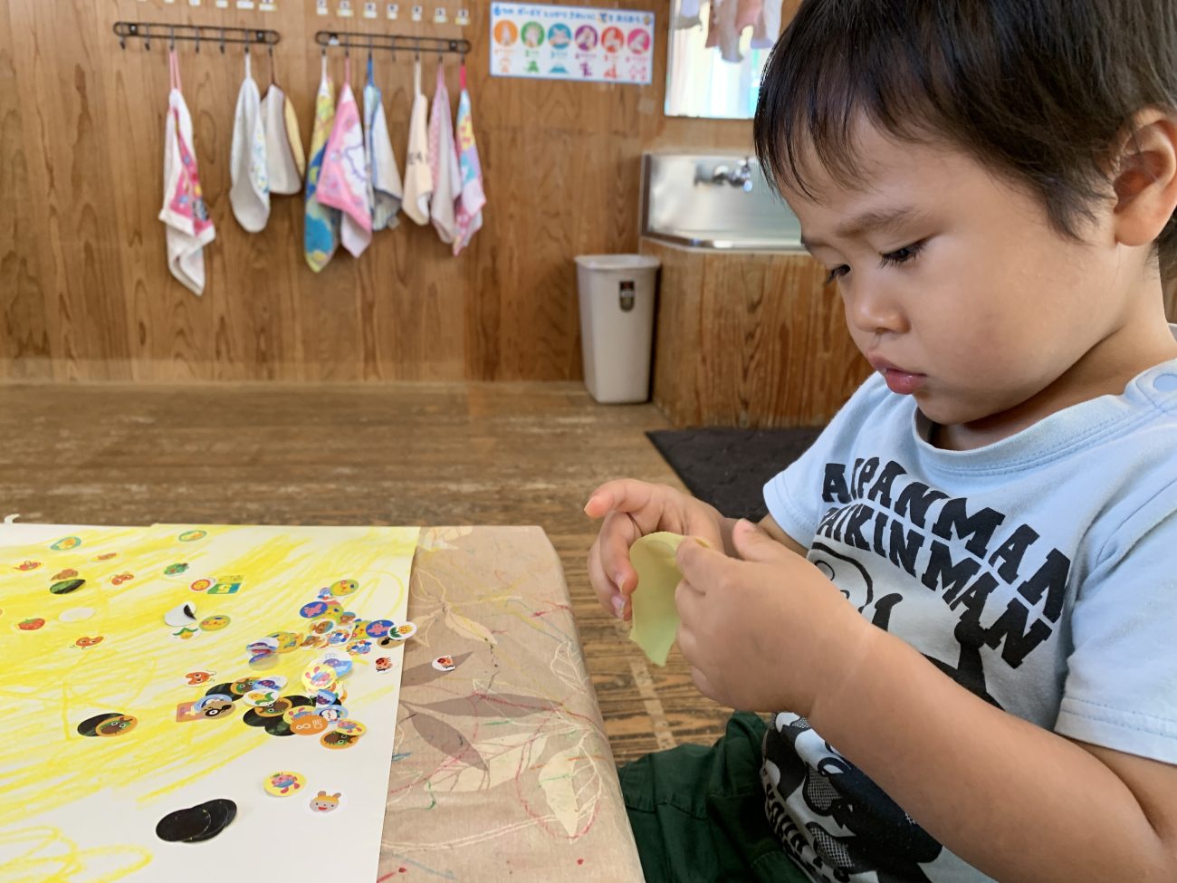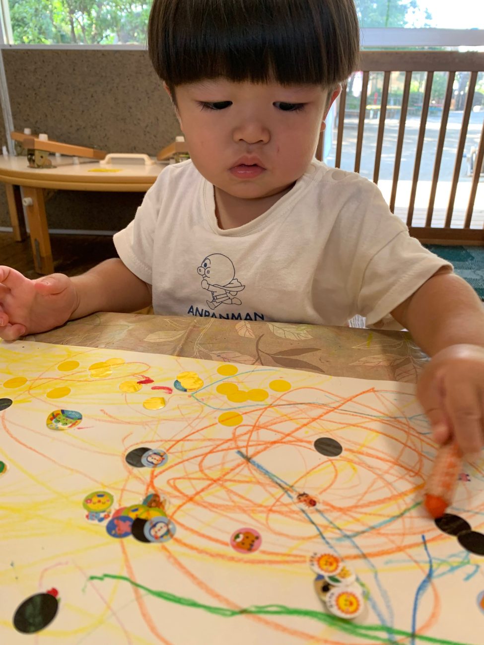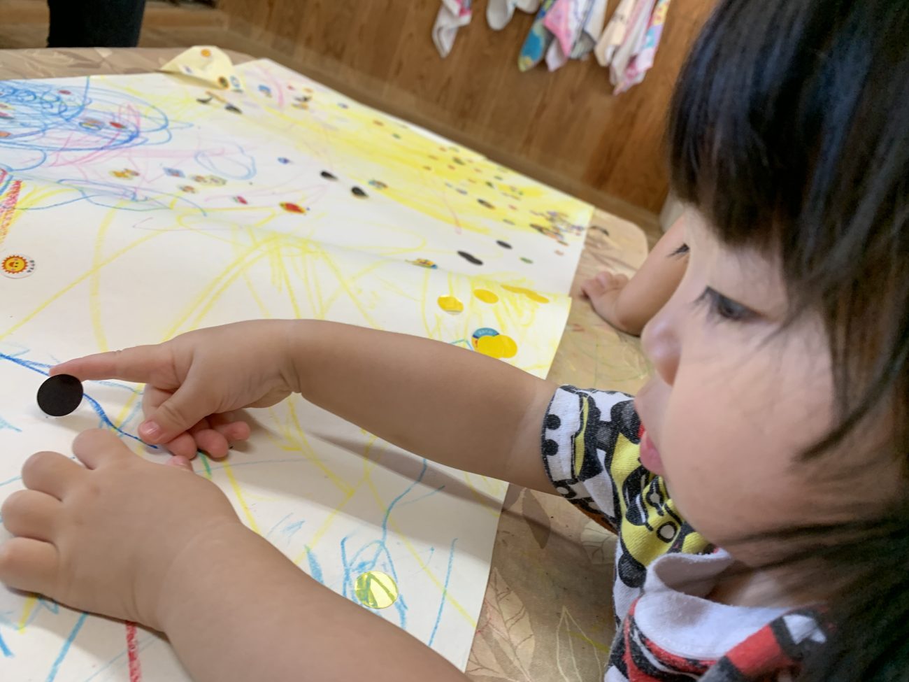 シールを剥離紙からはがすことが難しそうな時は、少し大人が手伝うことで、表と裏の違いに気付いてじっくりみたり、その後シールを紙に貼ることができていました。