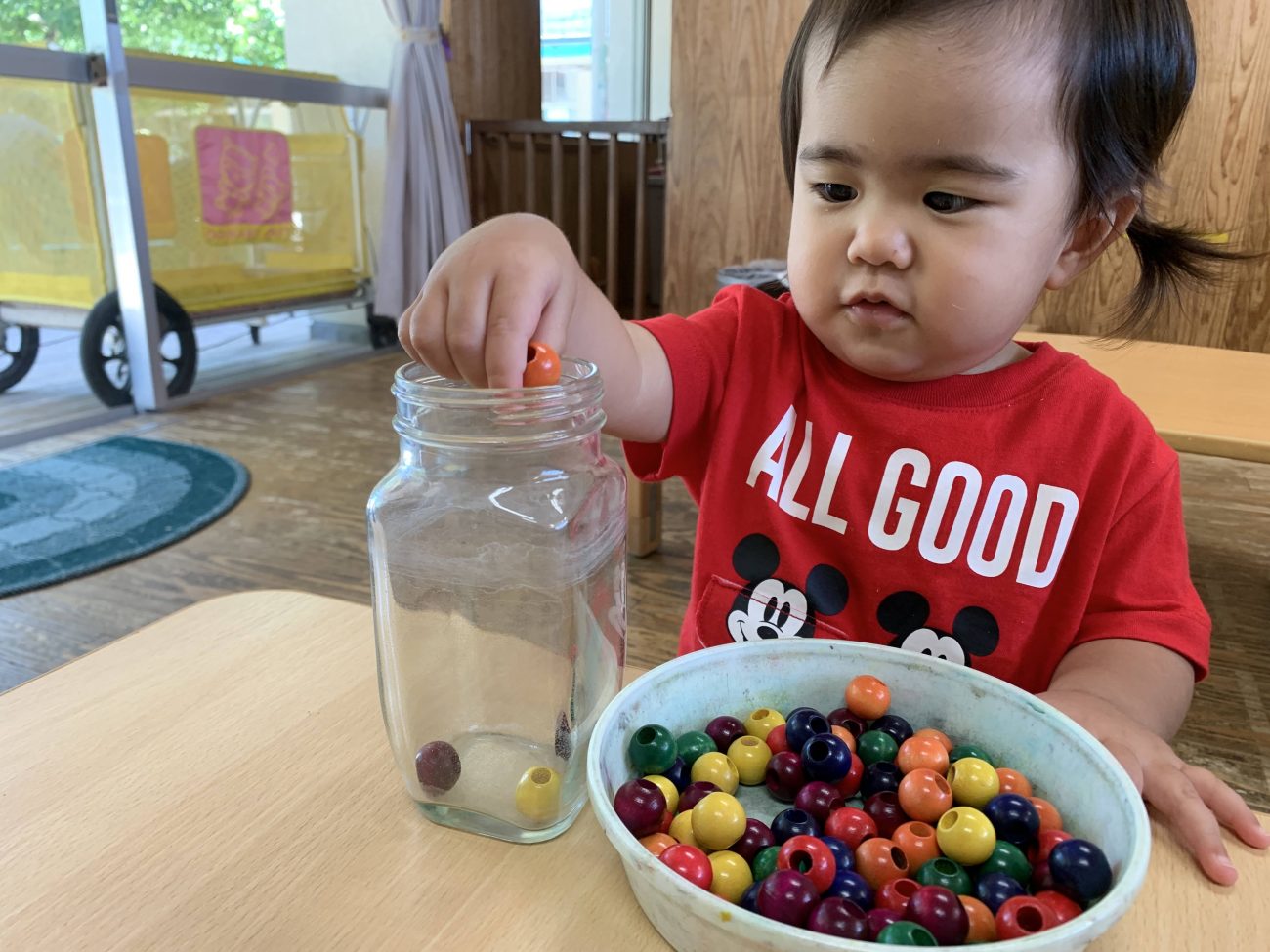 子どもたち自ら瓶に入れたビーズを皿に戻し、また1から行います。