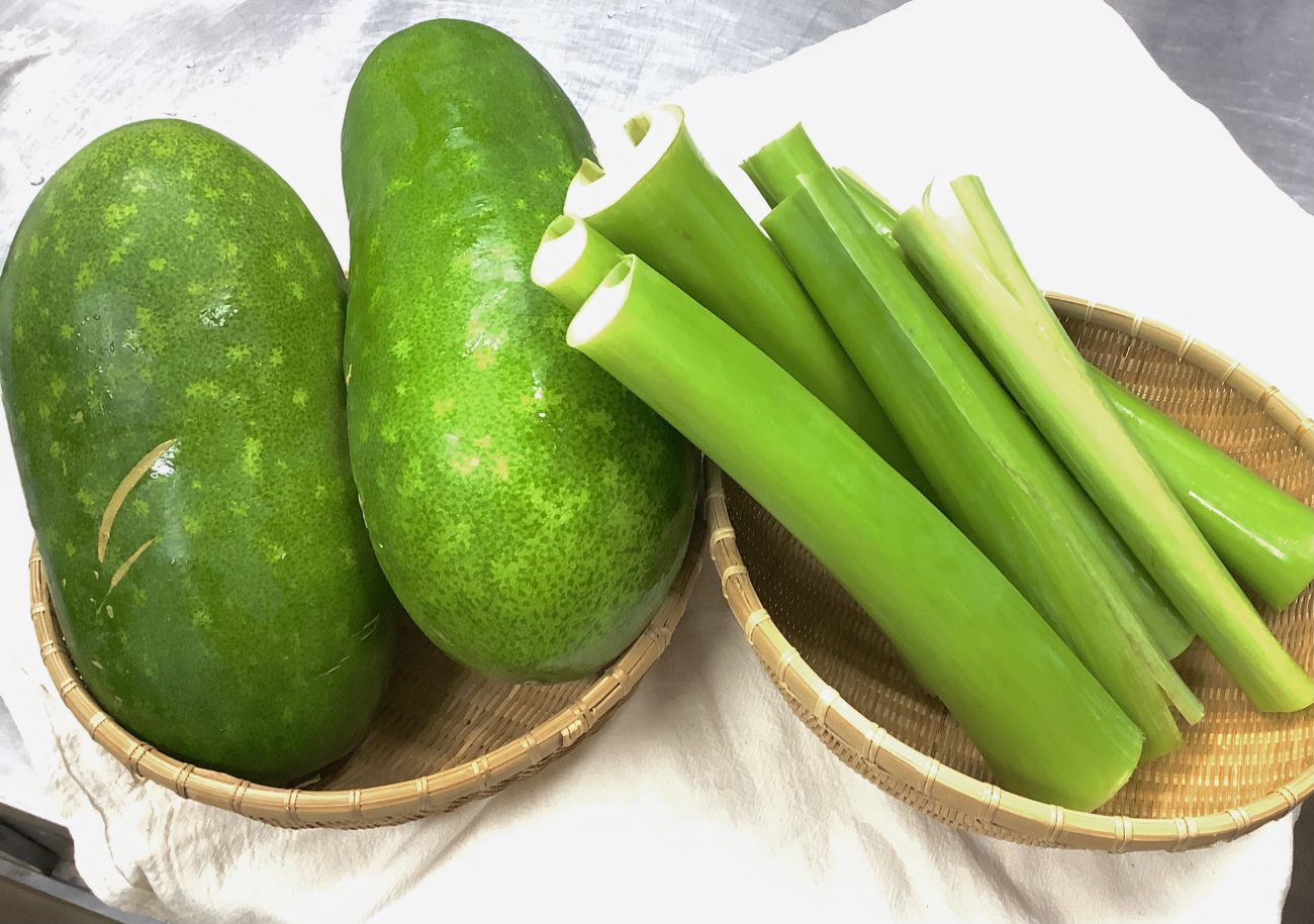 かいのこ汁は、粥の子がなまった呼び方だそうです。お盆に作られる精進料理の一つで鹿児島の郷土料理です。今回は、かぼちゃや人参、大豆、ごぼうの他に、ずいきを使用しました。ずいきは夏が旬の野菜となっていて、カロリーも低く糖質の低いヘルシーな野菜です。しっかり火を通すことで、とろっとしてとても食べやすくなりました。