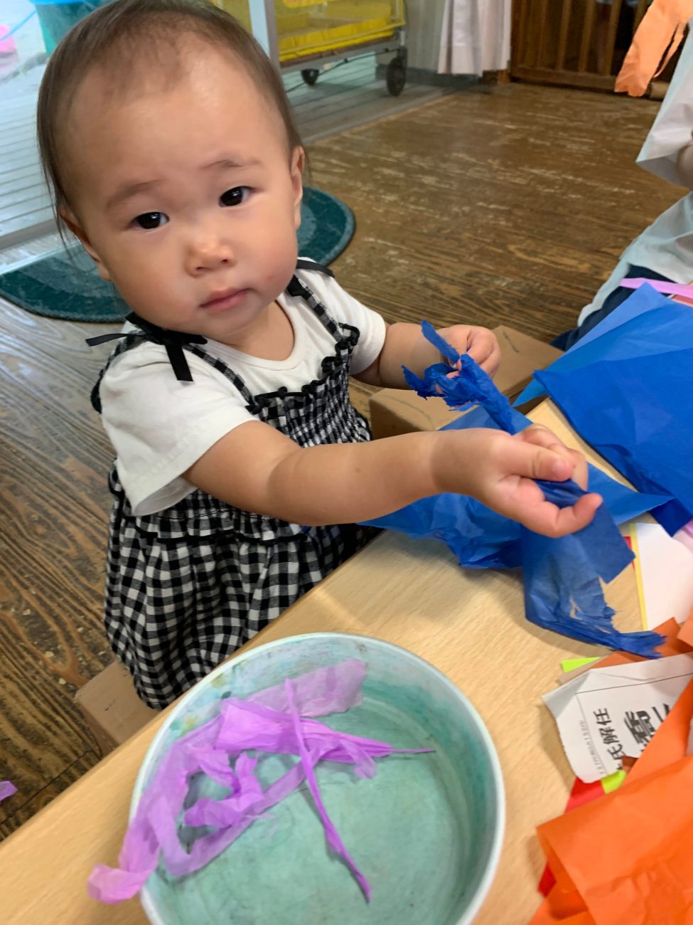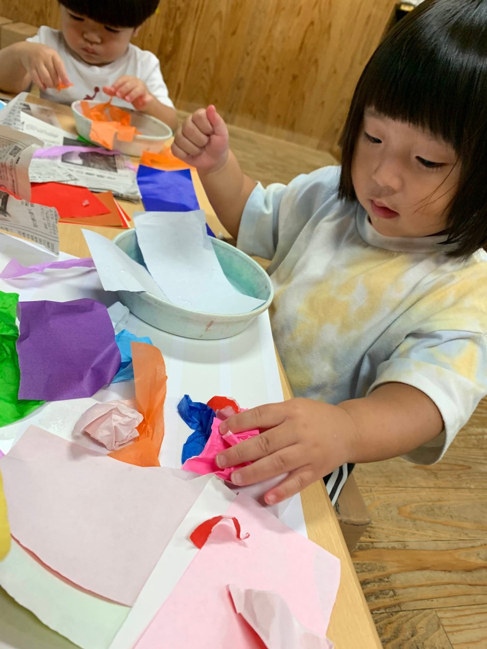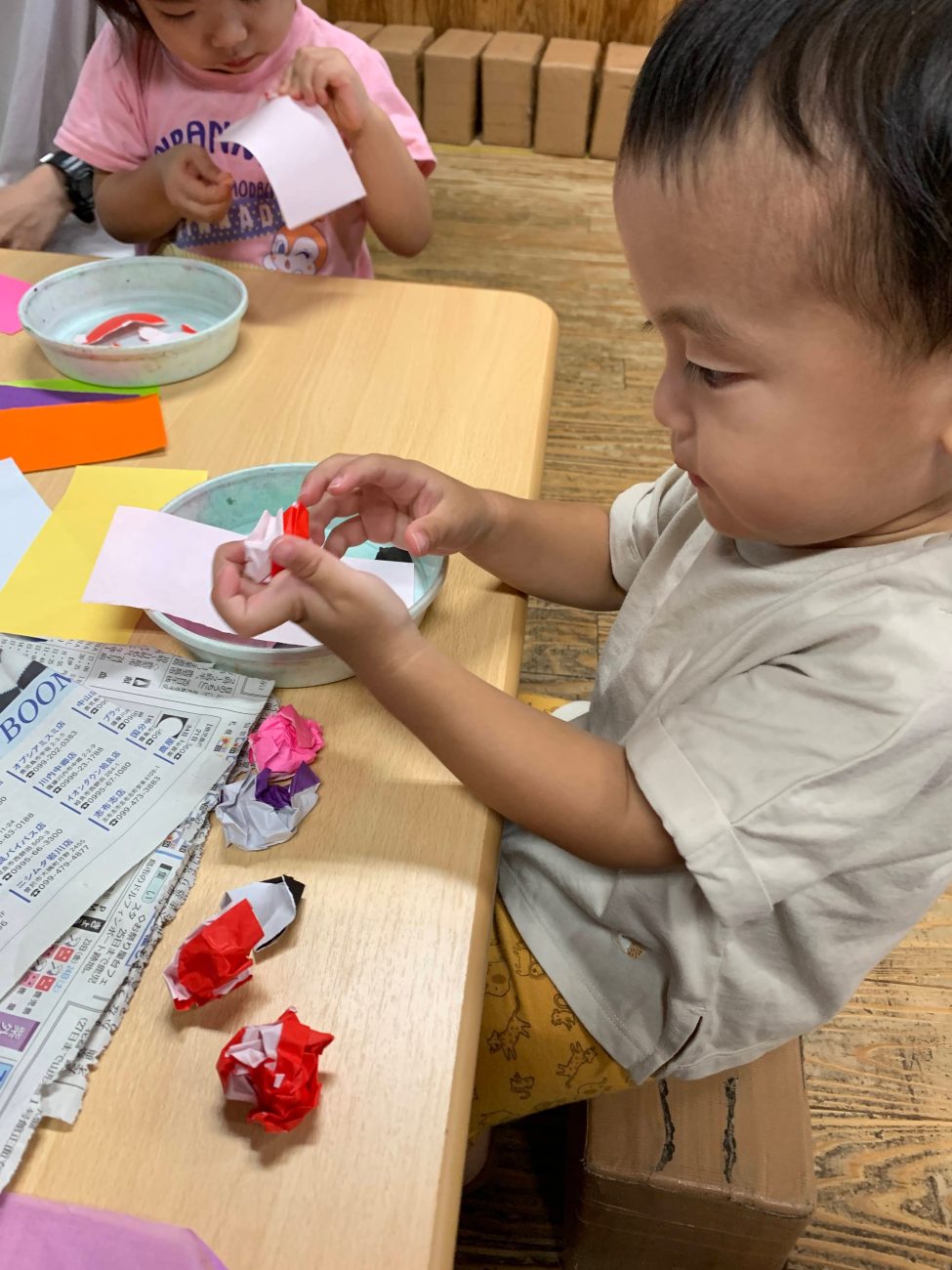 8月11日水曜日は子どもたちと紙をちぎって、貼る遊びを行いました。
