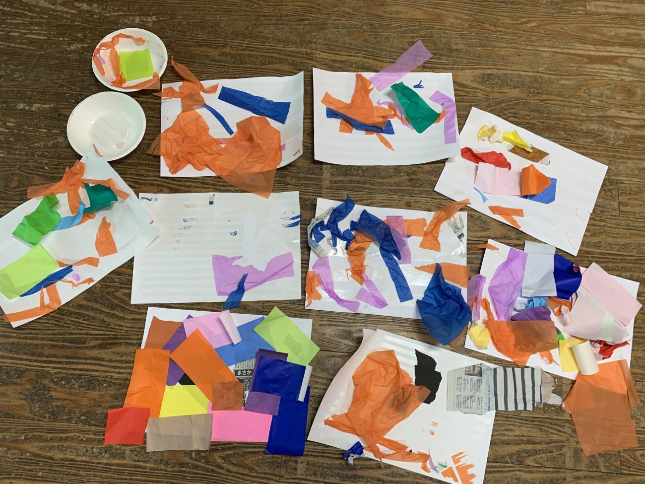 子ども一人一人が様々な素材・紙を自分で選び、自由に画用紙へ貼っていくことで、その子どもの個性が輝く素敵な作品に仕上がりました。