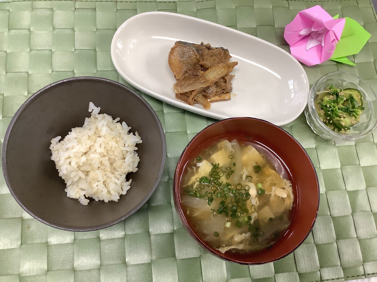 本日のメニューは”サバの味噌煮””きゅうりの胡麻和え””かき玉とろろ汁”でした。