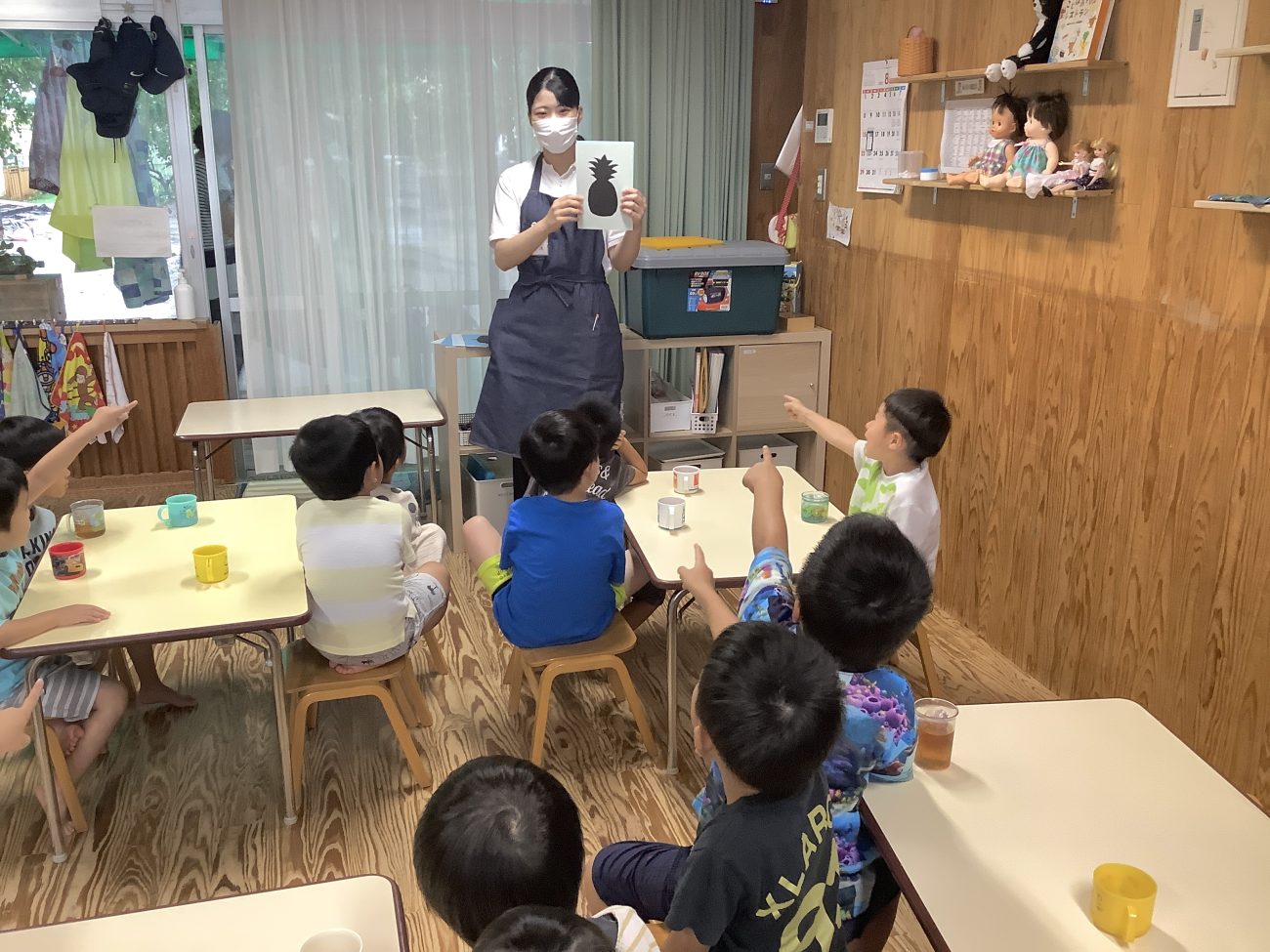 食育の内容は、【野菜のシルエット当て】でした。みんな質問に元気よく答えてくれて、最初は緊張していた実習生でしたが、次第に緊張がほぐれて笑顔が見れました。残り一週間の実習で、1つでも多くのことを身につけてもらえるよう、私たち給食室も精一杯頑張りたいと思います。
