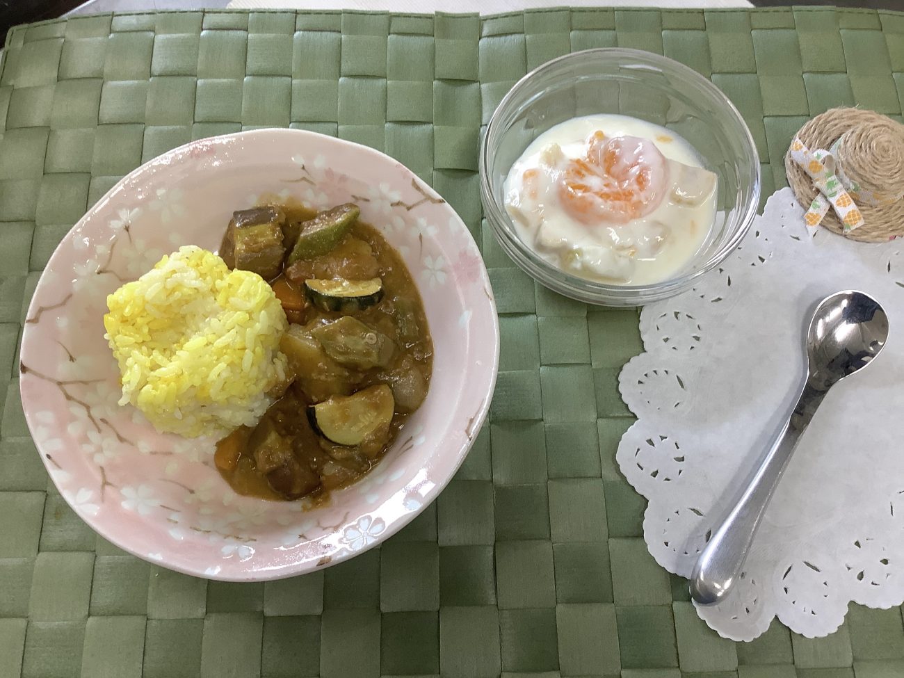 本日のメニューは、”ターメリックライス””夏野菜カレー””フルーツヨーグルト”でした。
