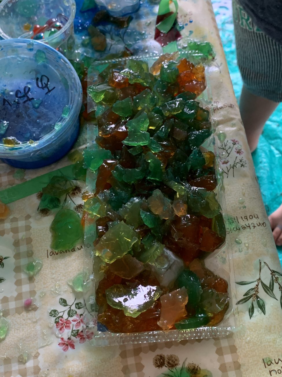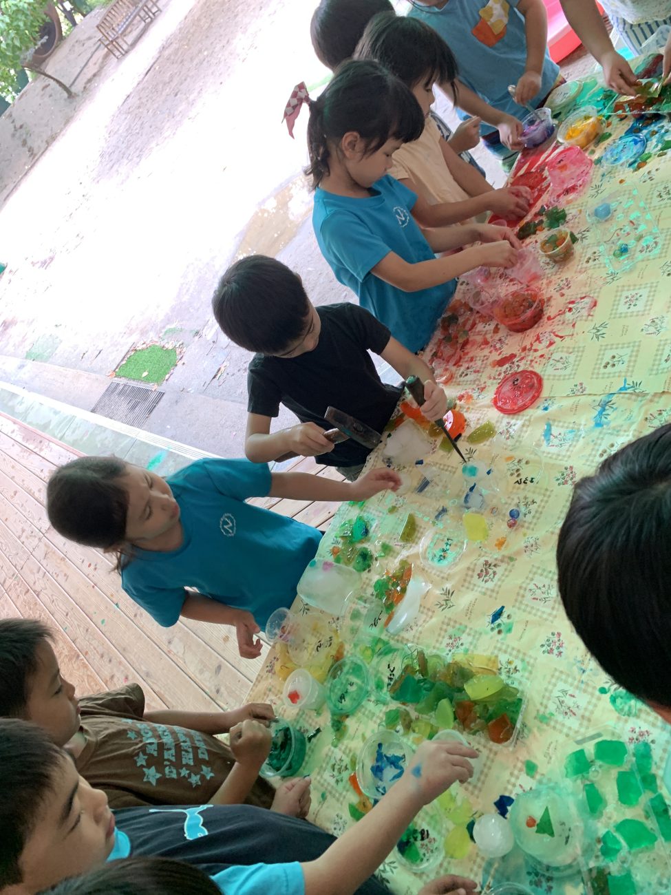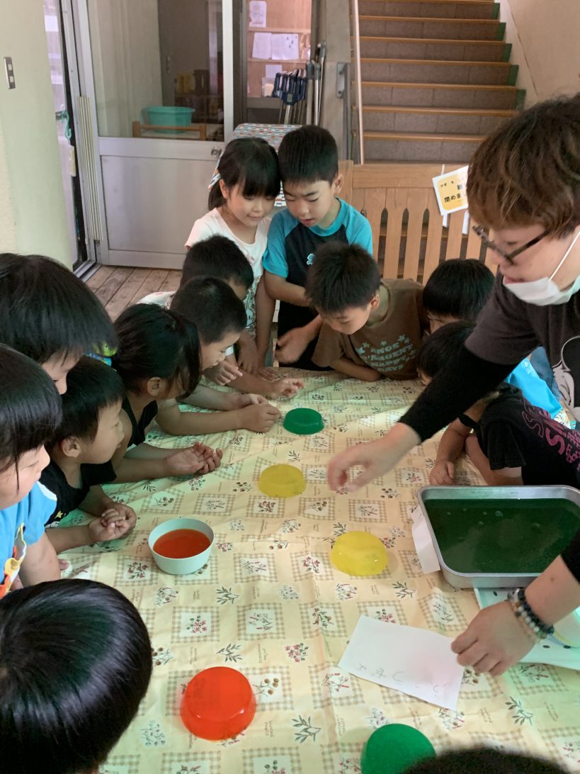 寒天の形を崩したり、氷を割っていく中で色の混ざり合いを楽しみます。