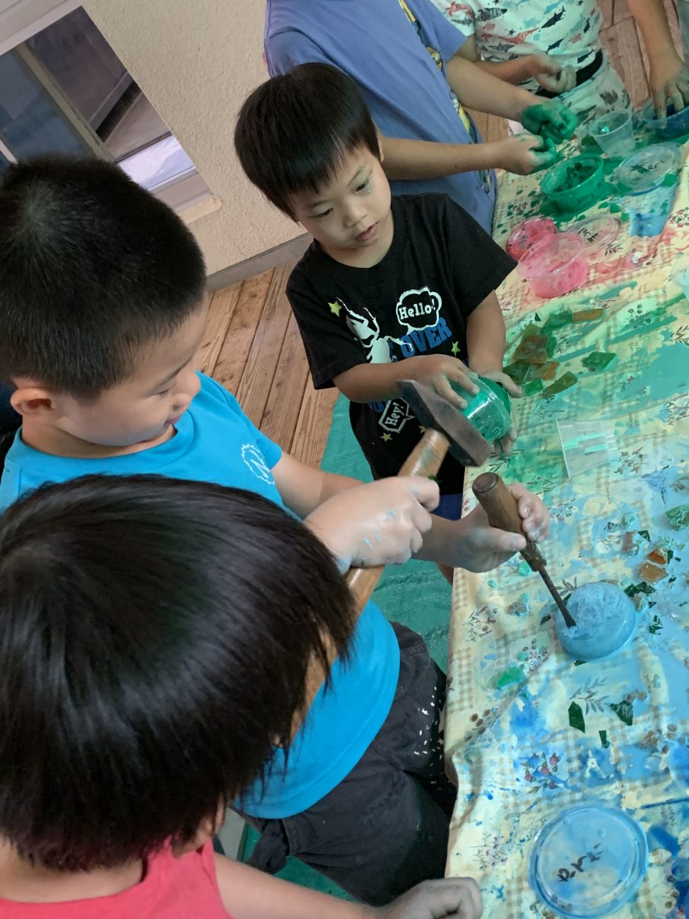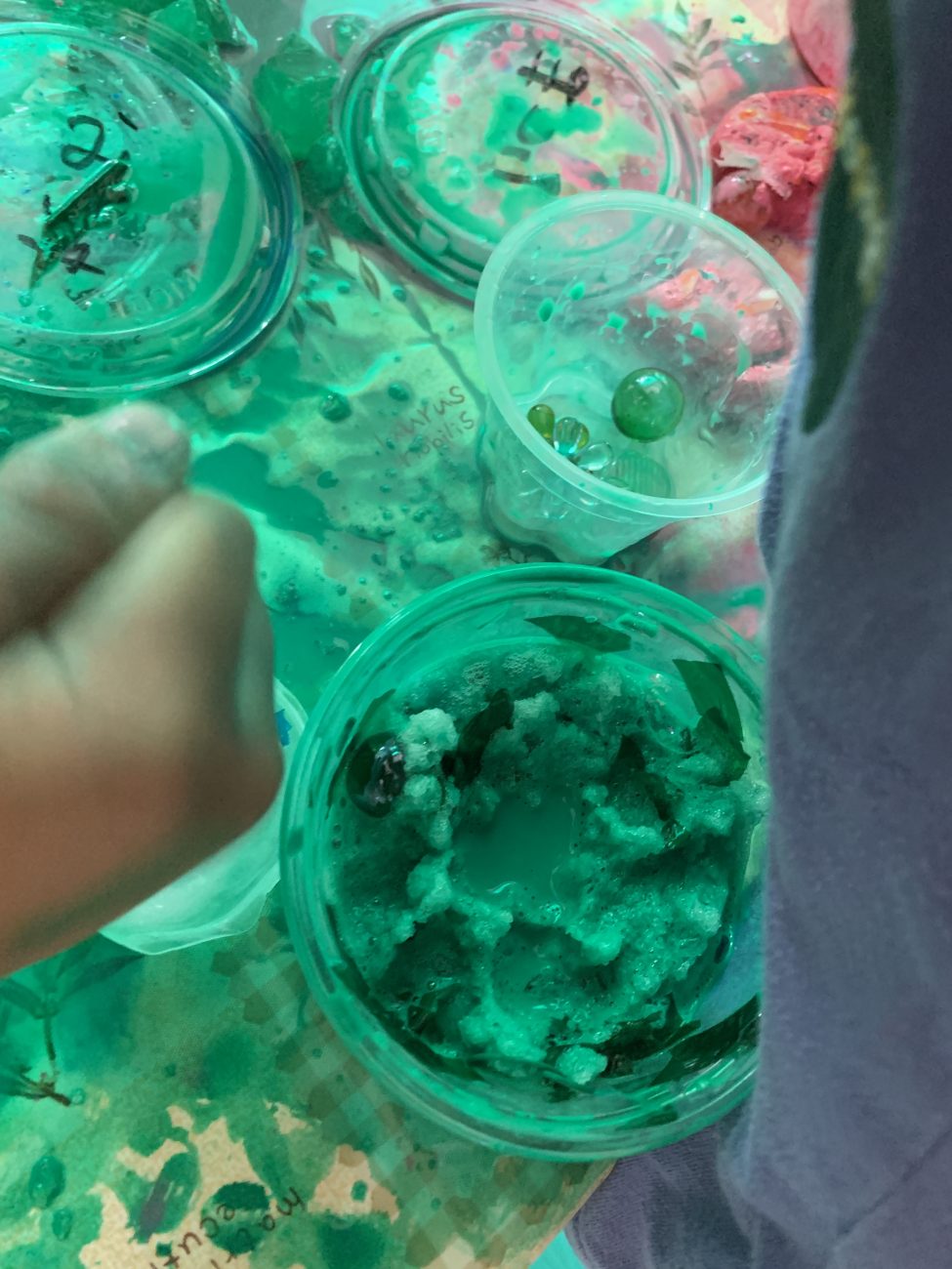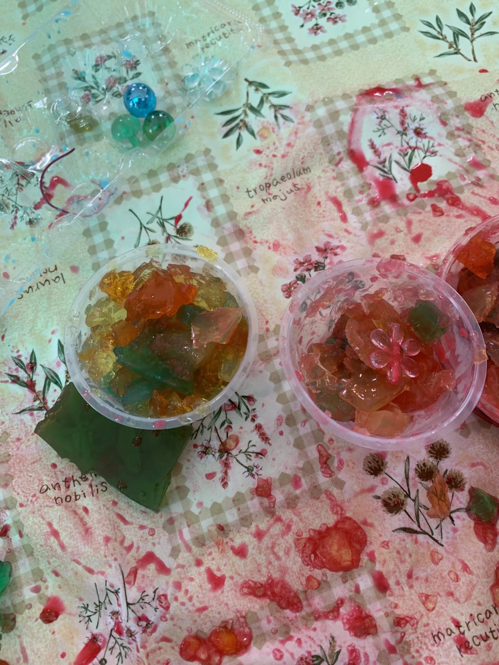 寒天の形を崩したり、氷を割っていく中で色の混ざり合いを楽しみます。