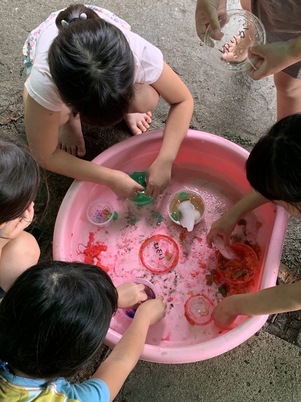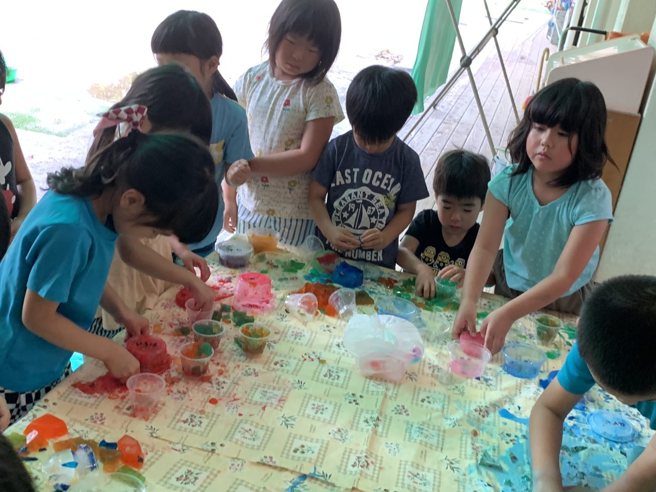 感触遊びの時間は1時間以上!寒天と氷の感触を味わうのはもちろんのこと、色の混ざり具合なども楽しみました。時間が経つにつれて【ごっこ遊び】も展開され、子ども達が今までの遊びを元にどんどん展開して遊び込む時間となりました。