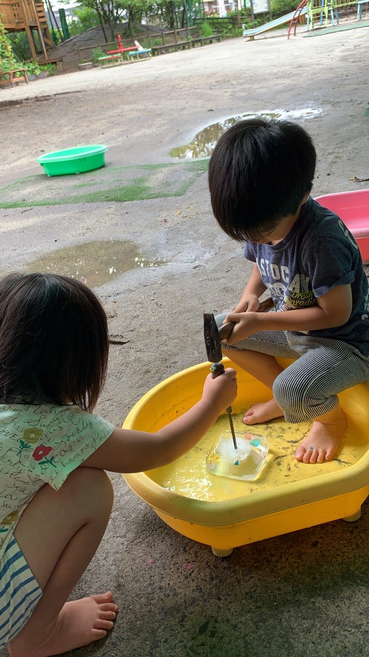 そこへ、卵のパックやプリンカップを投入。すぐに、遊びの中に取り入れる子ども達。1つ道具が加わる事で遊びも展開。次第にゼリーやアイスに見立て、アイスクリーム屋さんのごっこ遊びへ展開。氷をスプーンで削るように細かく砕き“かき氷”の様にしている子もいました。