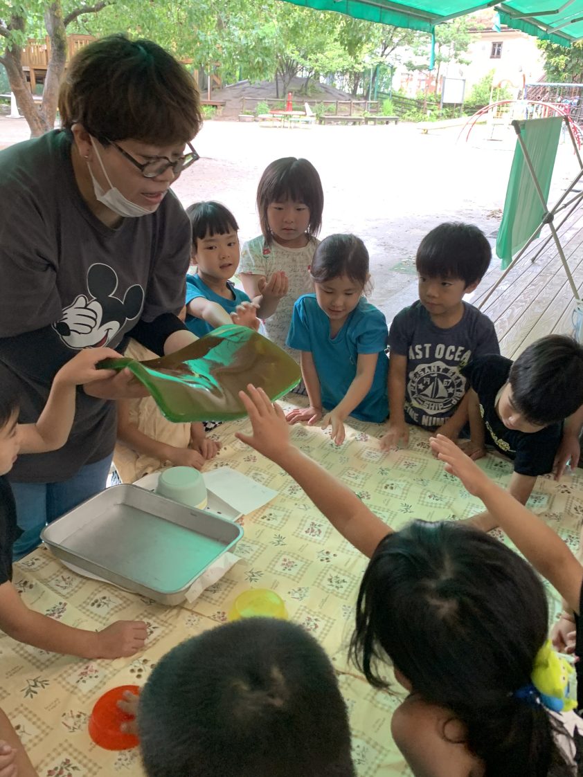 次は、氷も加え遊びを続行。まず、容器から氷を取り出すにはどうする??机に容器を軽く叩きつけ取り出そうとする子。容器全体を手の平で覆って、手の熱で少し溶かして取り出そうとする子。『どうすればいい?』って聞いてくる子はいなったです。それぞれの試行錯誤で取り出していました。