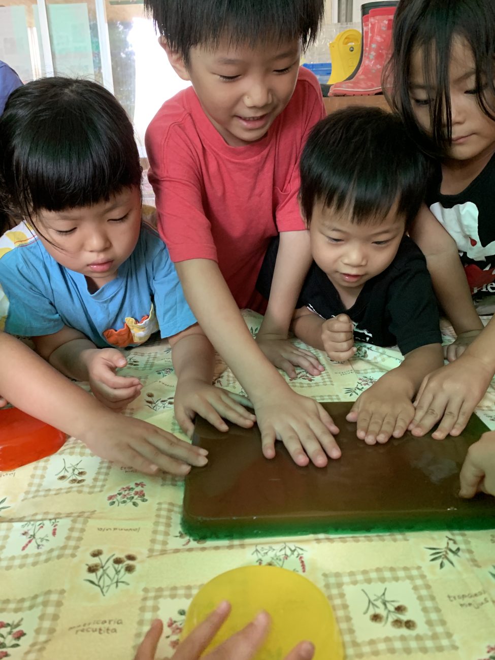 寒天は、2種類の固さを作りました。固さの違いを感じるために、子ども達もゆっくりと丁寧に撫でたり、指を弾ませてみたり。