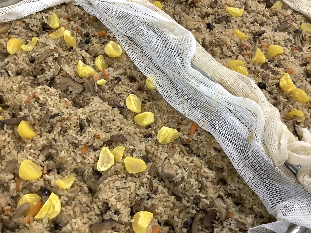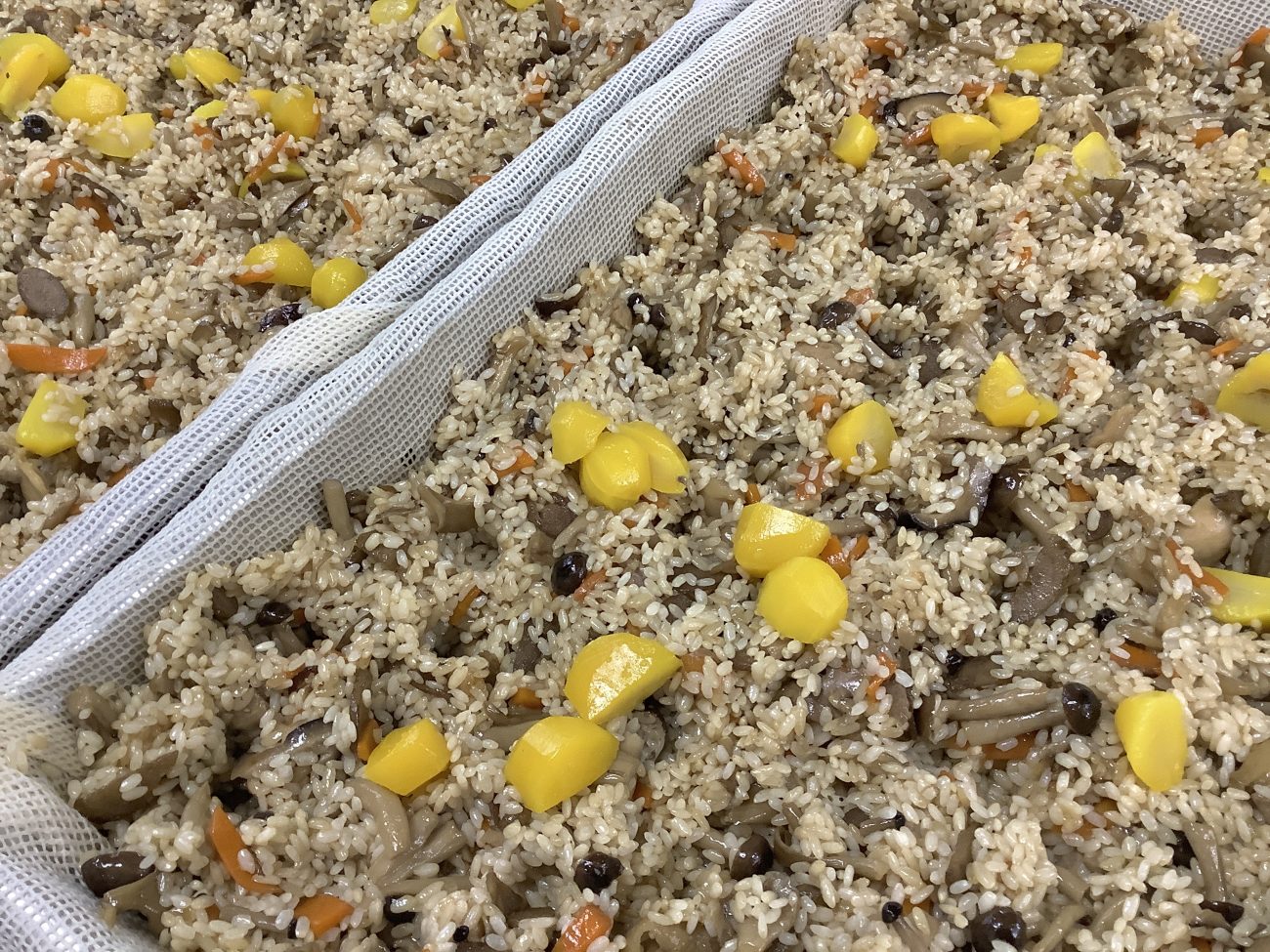 きのこのおこわは、しめじ・椎茸・舞茸とたっぷりのきのこ類が入り、秋を感じるおこわとなりました。栗も入り、子どもたちは、どうして栗は黄色いの?どうやって栗ってできてるの?と興味津々な様子で、一口食べると、美味しい!と言って沢山食べてくれました。