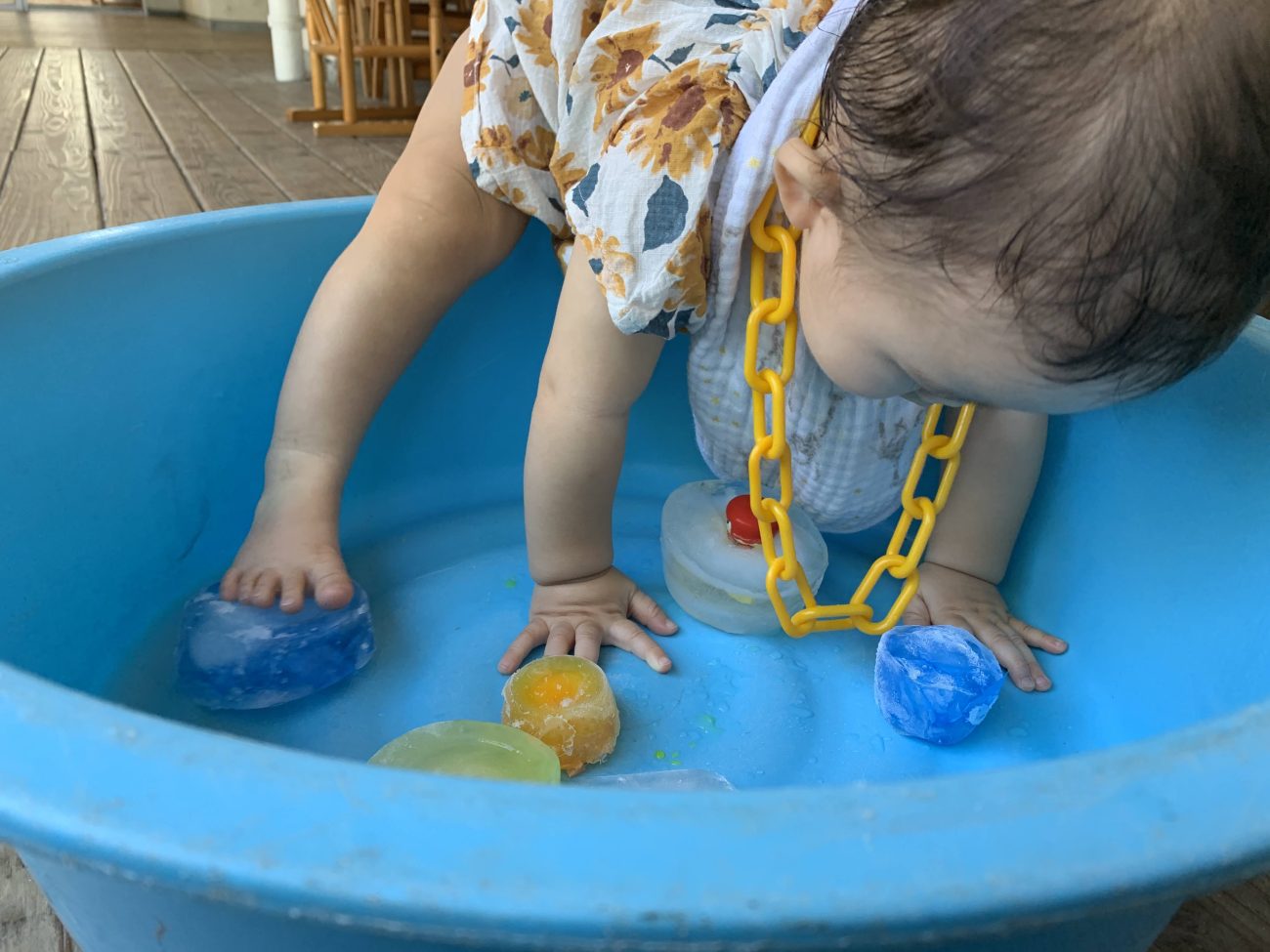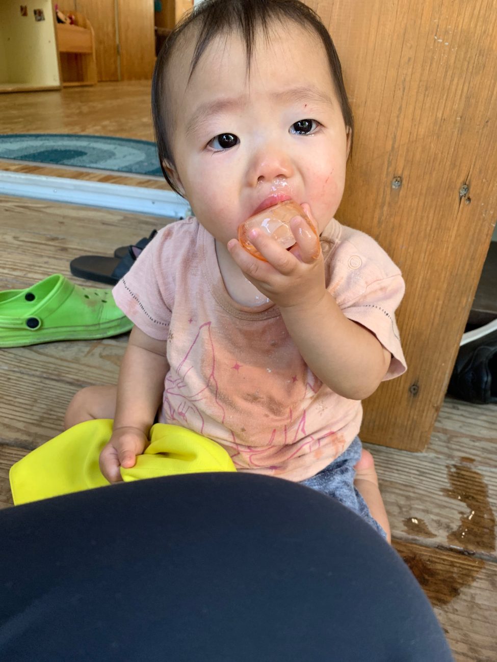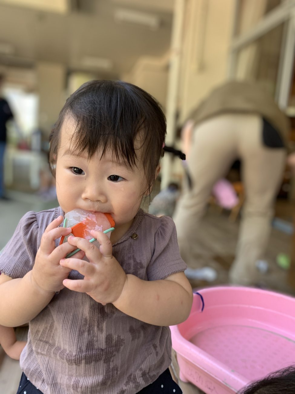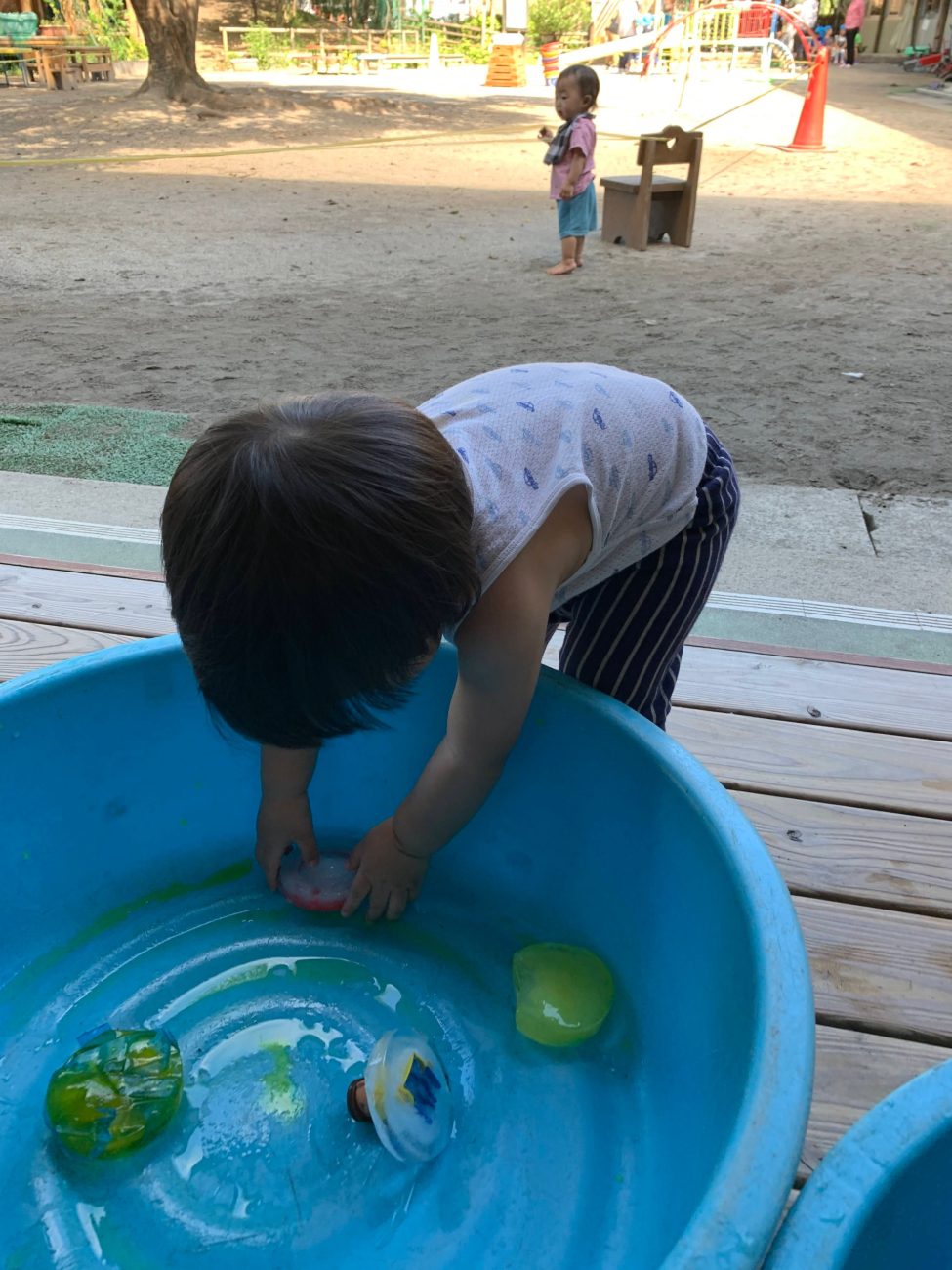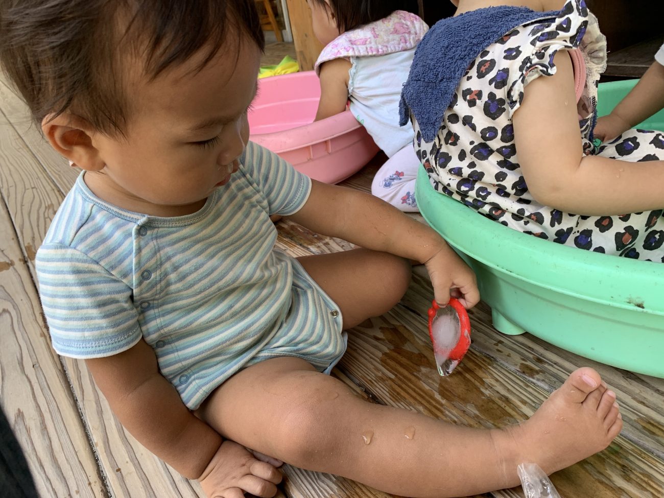 冷たさに慣れると口に含んでちゅぱちゅぱ吸う姿も見られました。自然と溶けている事に気づいての行動なのかなと思います。また、時間が経つにつれてタライに水が溜まってきて、その水でぱしゃぱしゃと遊ぶ子もいました。氷が溶けるという現象を目の当たりにすることができたと思います。このような一つひとつの小さな経験が子ども達の成長に繋がればいいなと感じています。