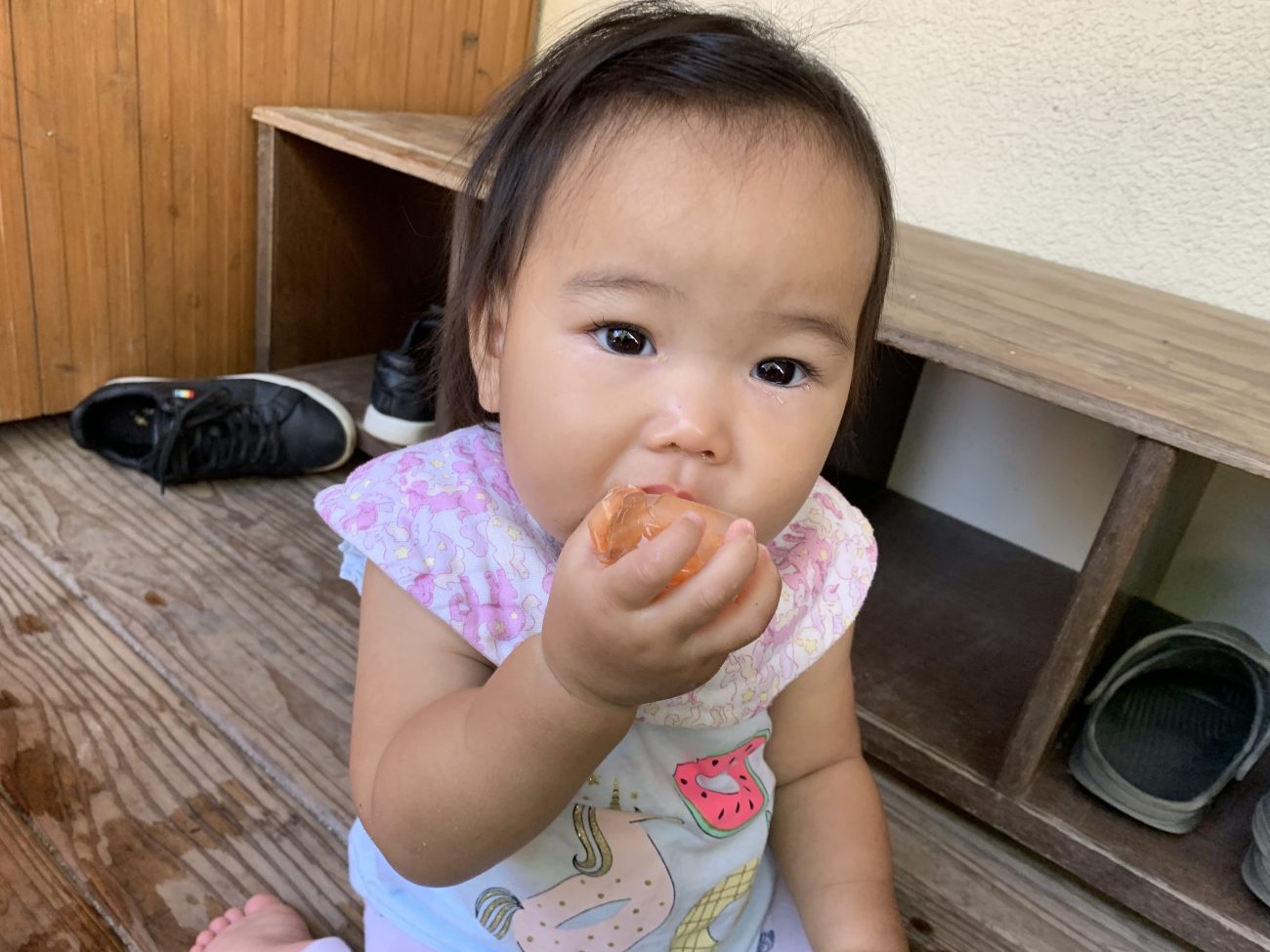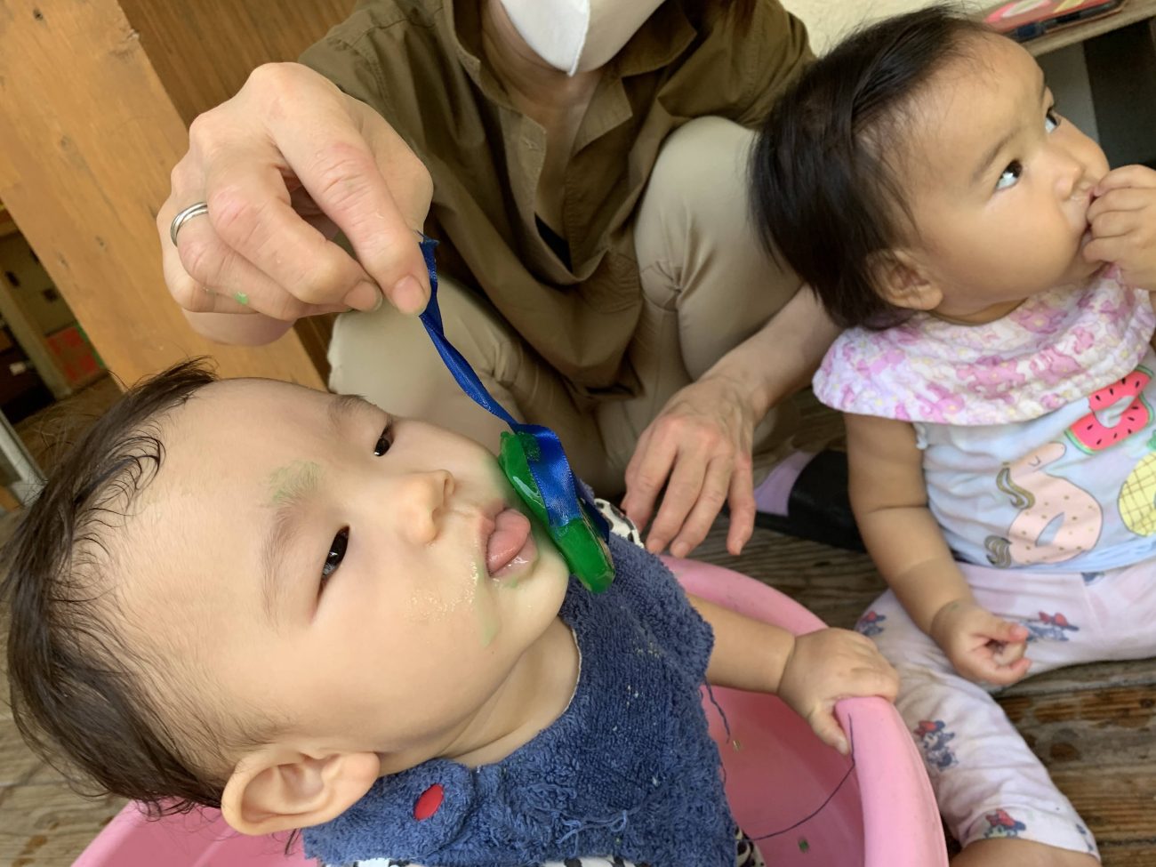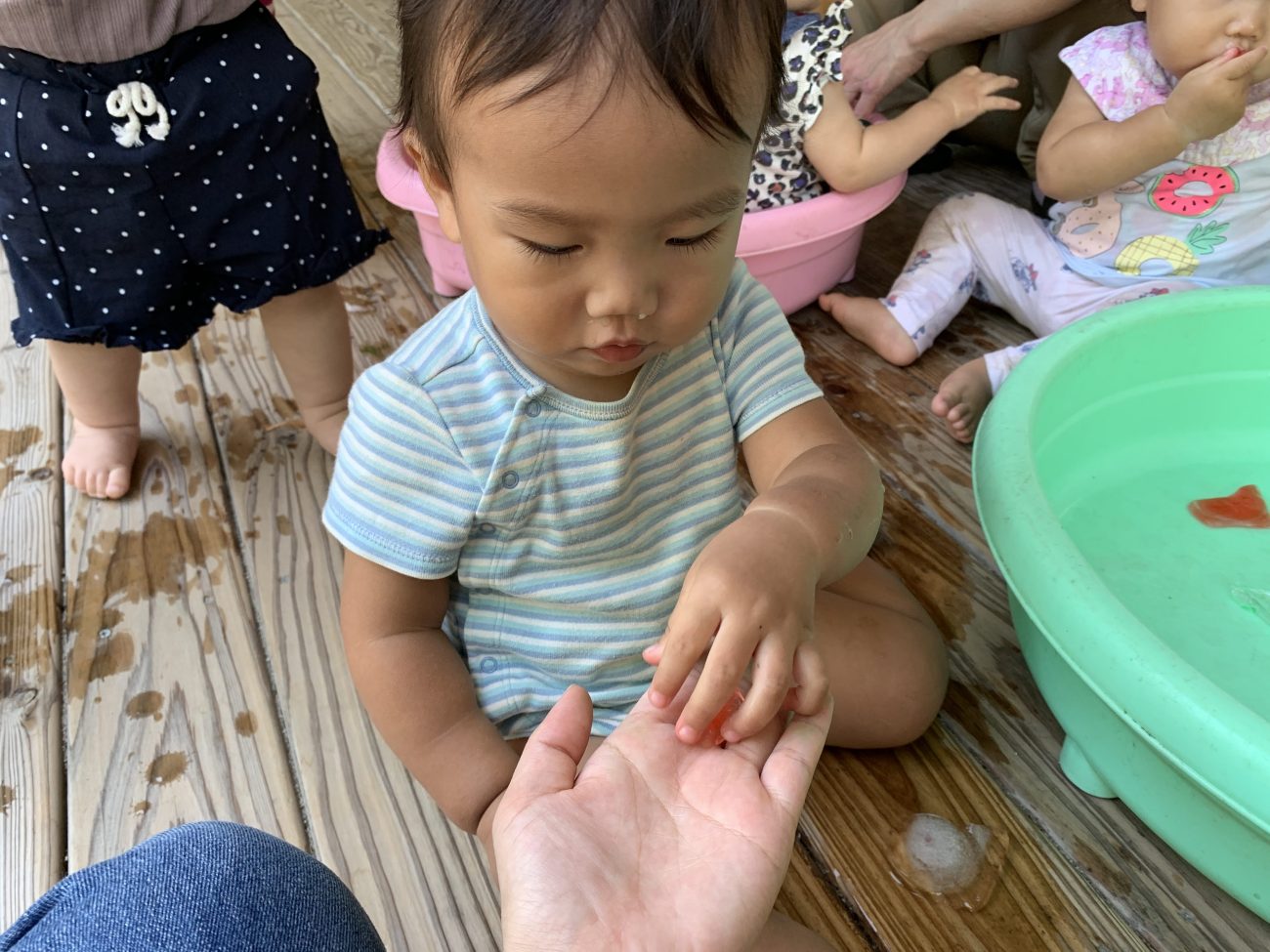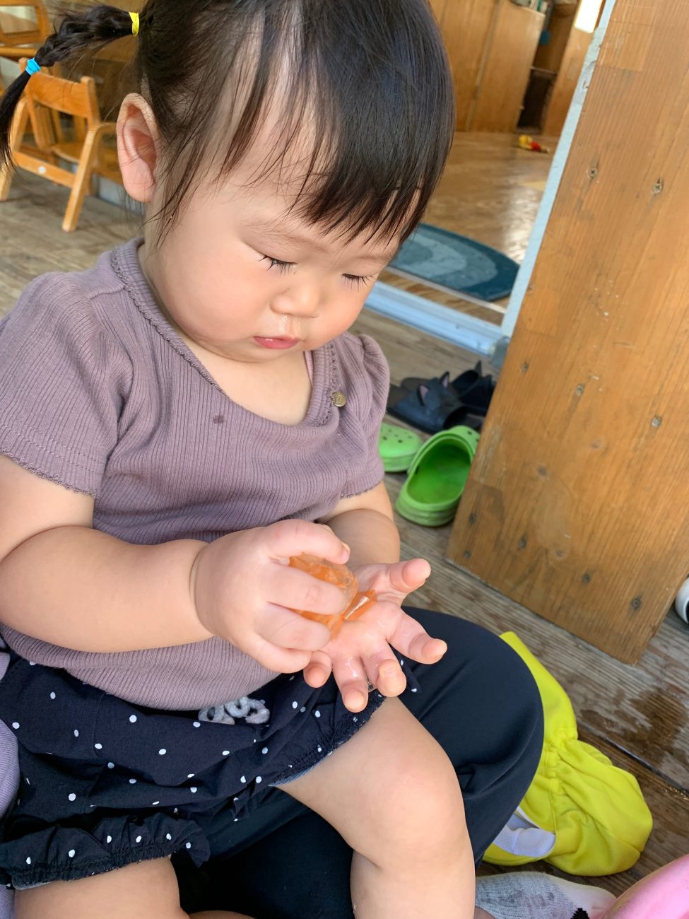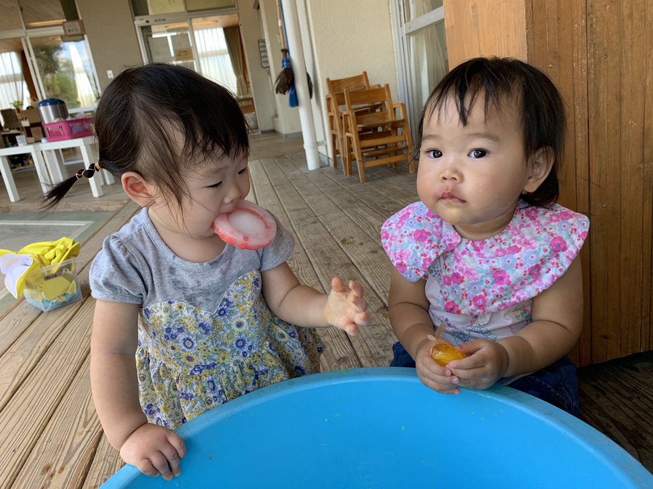 冷たさに慣れると口に含んでちゅぱちゅぱ吸う姿も見られました。自然と溶けている事に気づいての行動なのかなと思います。また、時間が経つにつれてタライに水が溜まってきて、その水でぱしゃぱしゃと遊ぶ子もいました。氷が溶けるという現象を目の当たりにすることができたと思います。このような一つひとつの小さな経験が子ども達の成長に繋がればいいなと感じています。