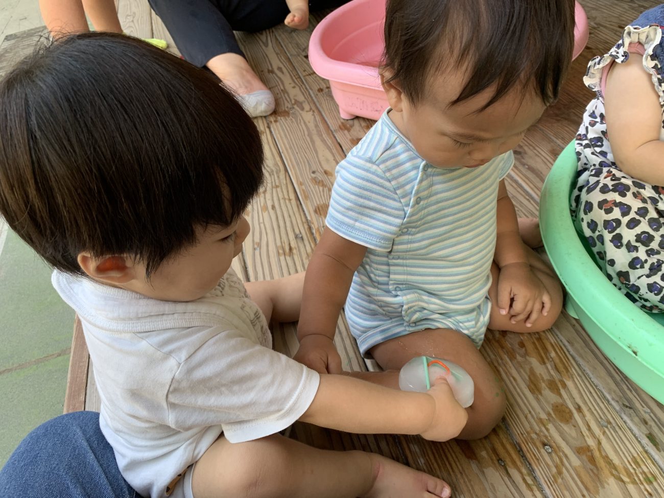 最近は自分が持っているものを「どうぞ!」と渡してくれたり、手で「貸して」とジェスチャーもできるようになってきました。一つの氷を囲んでさまざまな子ども達のやりとりも見る事ができました。もちろん取り合いになることもありますが、保育者の見守りの元でケンカをして友達との関わりを経験しています。