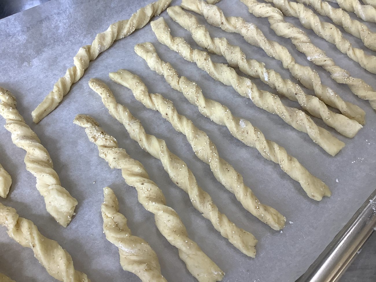 生地も小麦粉やドライイースト、豆乳、バター、粉チーズ、きび糖、塩を使い、いちから作りました。五分づき米にも入っているもちあわを入ることで、食べたときにパチパチといいアクセントになります。生地を伸ばし、切った後、クルクルと丸めしっかりと焼きました。少し冷めると、生地が固くなり、食感を楽しむことができます。