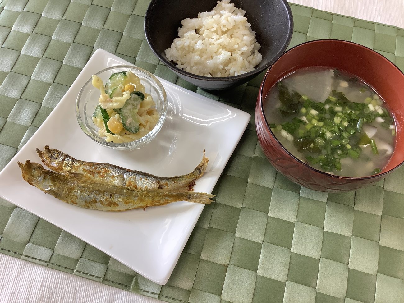 本日のメニューは”ししゃものカレー焼き””フジッリサラダ””しいたけのみそ汁”でした。