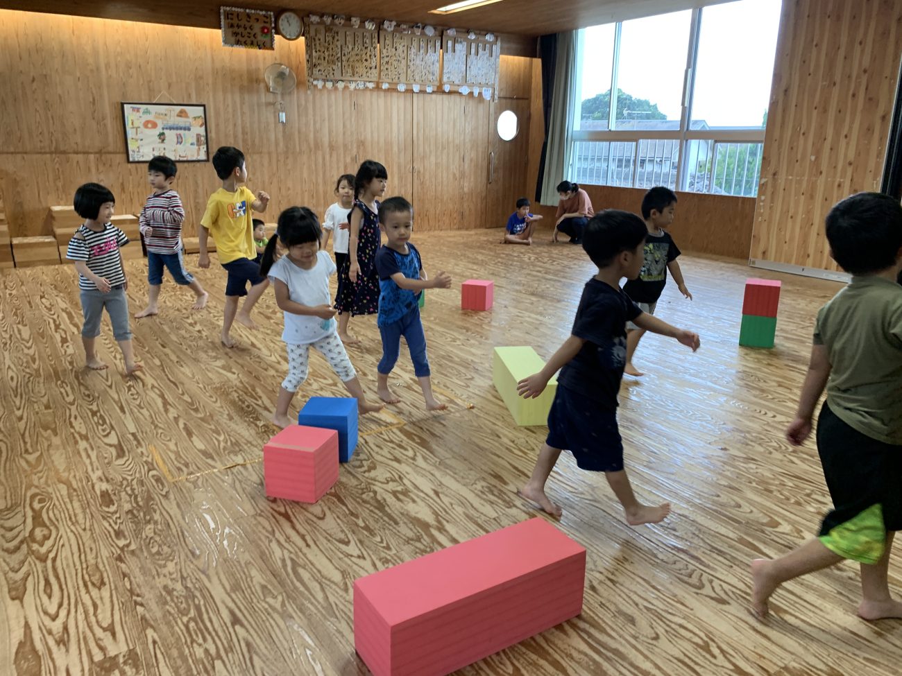 プラホーミング(カラフルな積み木のような物)を置く事で子どもの動きが交差し、それによって「ぶつからないようにする」という意識の芽生えを促します。回数を積み重ねていくことで、子どもたち自身で理解しリトミックを楽しんでいました。ピアノの音を耳で聞き分け、身体の動きに強弱をつけることがとても上手になっていました。