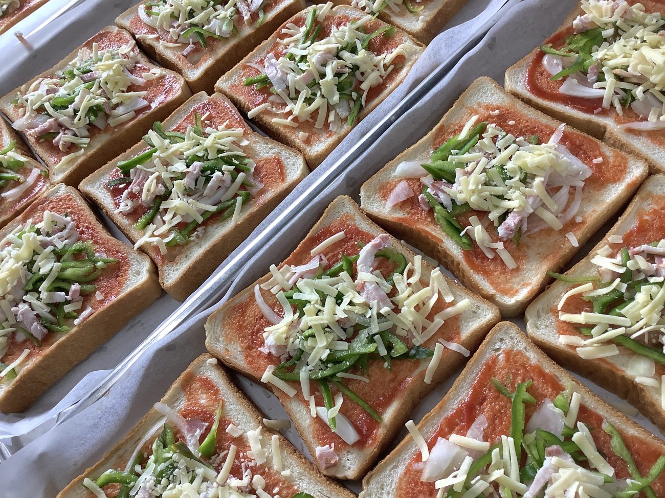 食パンにケチャップとトマトピューレなどを合わせたタレぬり、玉葱、ピーマン、ベーコン、そしてチーズをのせて焼きました。ピーマンの苦味をチーズが消してくれて、とても食べやすいピザトーストになりました。おかわりも沢山作りましたが、どのクラスもおかわりに何度も来てくれて、すぐに完売しました。