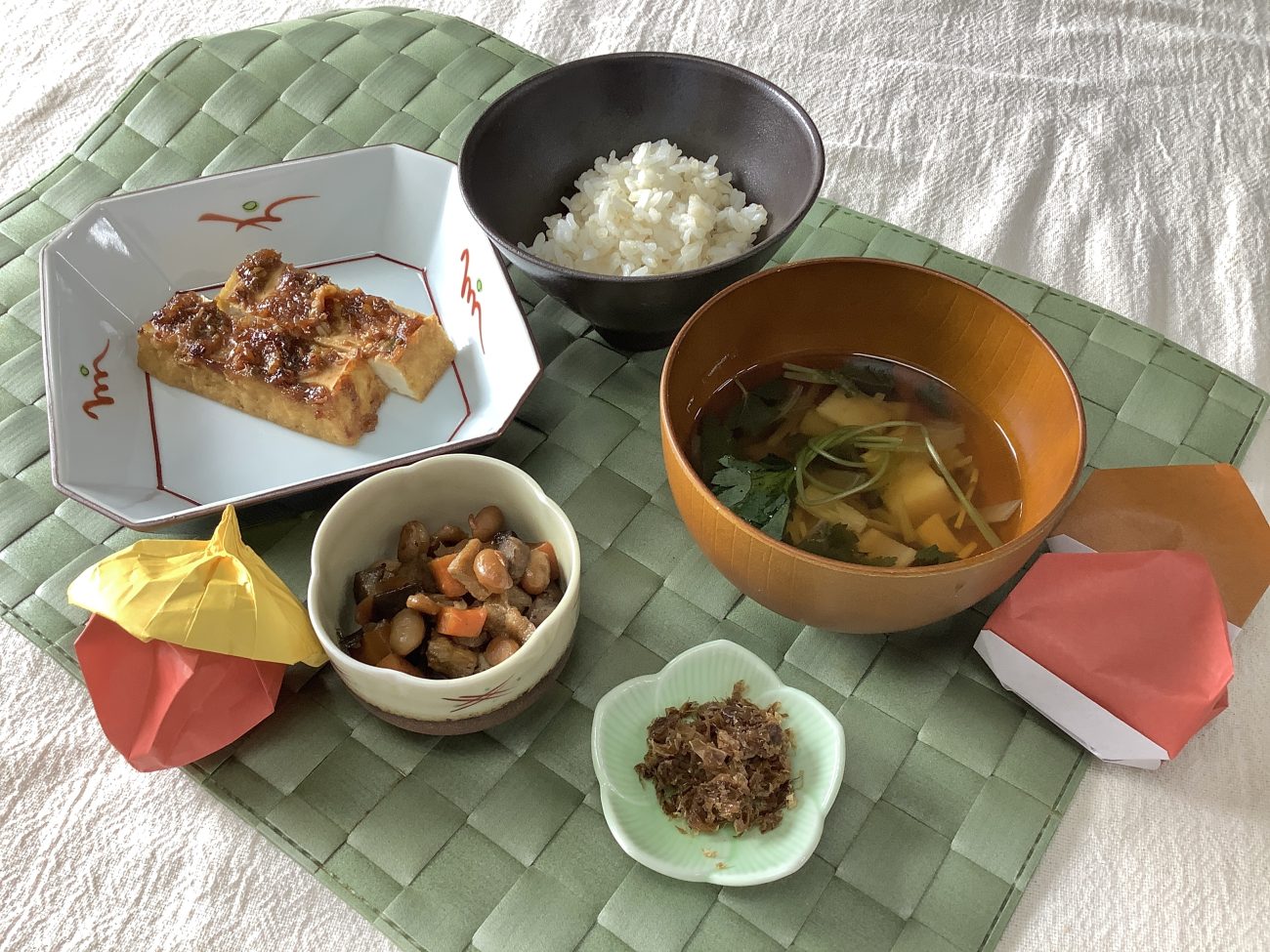 本日のメニューは”厚揚げのねぎ味噌焼き””五目豆””車麩のすまし汁”でした。