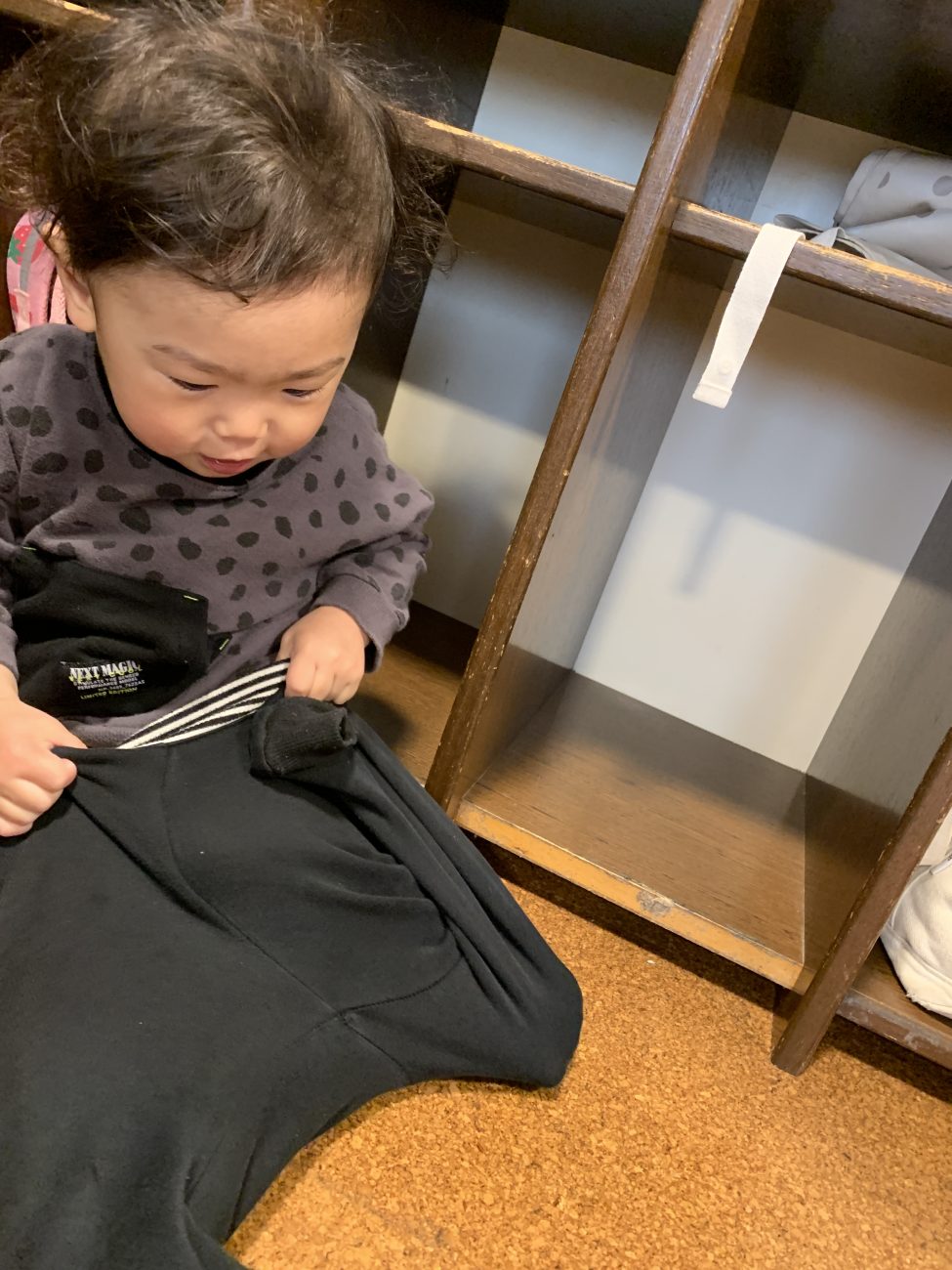 最近では洋服やオムツの着脱など「自分で」が出てきました。進級に向けてオムツマットを使って着替えをしたり、食事もスプーンを使って食べたりと自分でできることが少しずつ増えています。