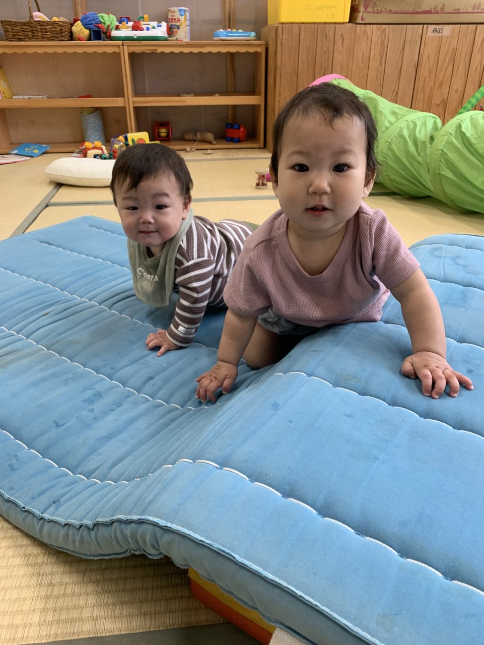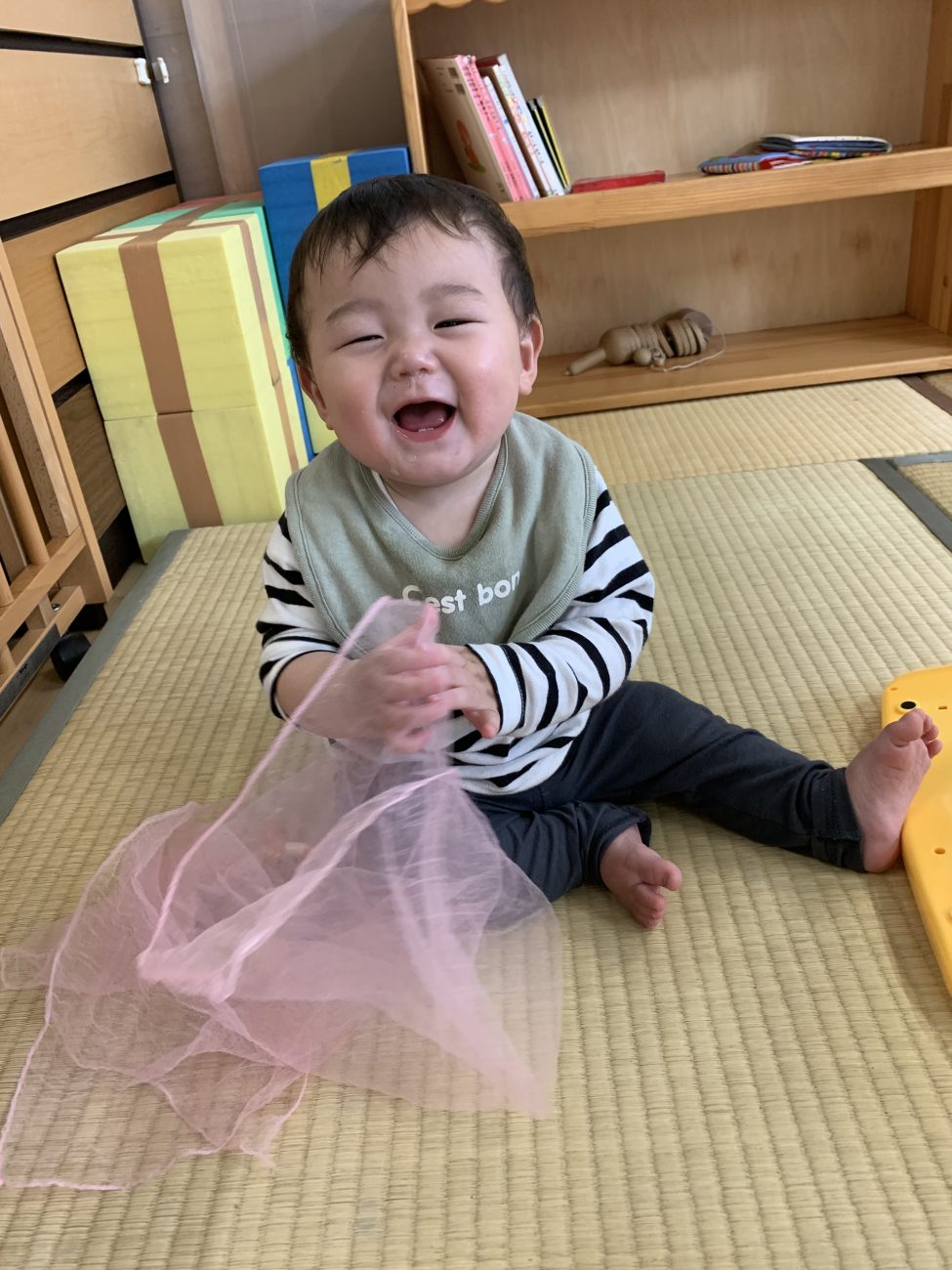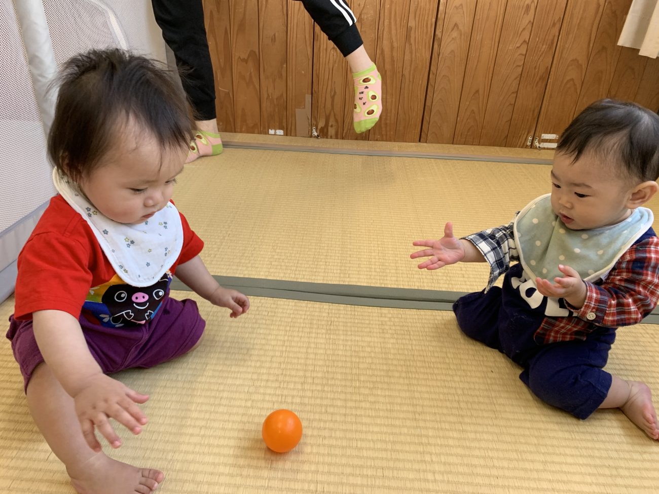 初めは各々好きなおもちゃを見つけ1人で遊ぶことを楽しんでいましたが、徐々に友達の存在を意識し始め、一緒に絵本を見ることから始まり(物の共有)、今では段ボールの中に一緒に入りバスごっこ(場の共有)を楽しむ姿も出てきました。最近では喃語や指差しで子どもたちのみでやりとりする姿をよく目にします。私には分からなくても子どもたち同士ではしっかり理解し合い一緒に遊ぶ姿をみて子どもたち同士で通じ合っているのだなと実感しました。